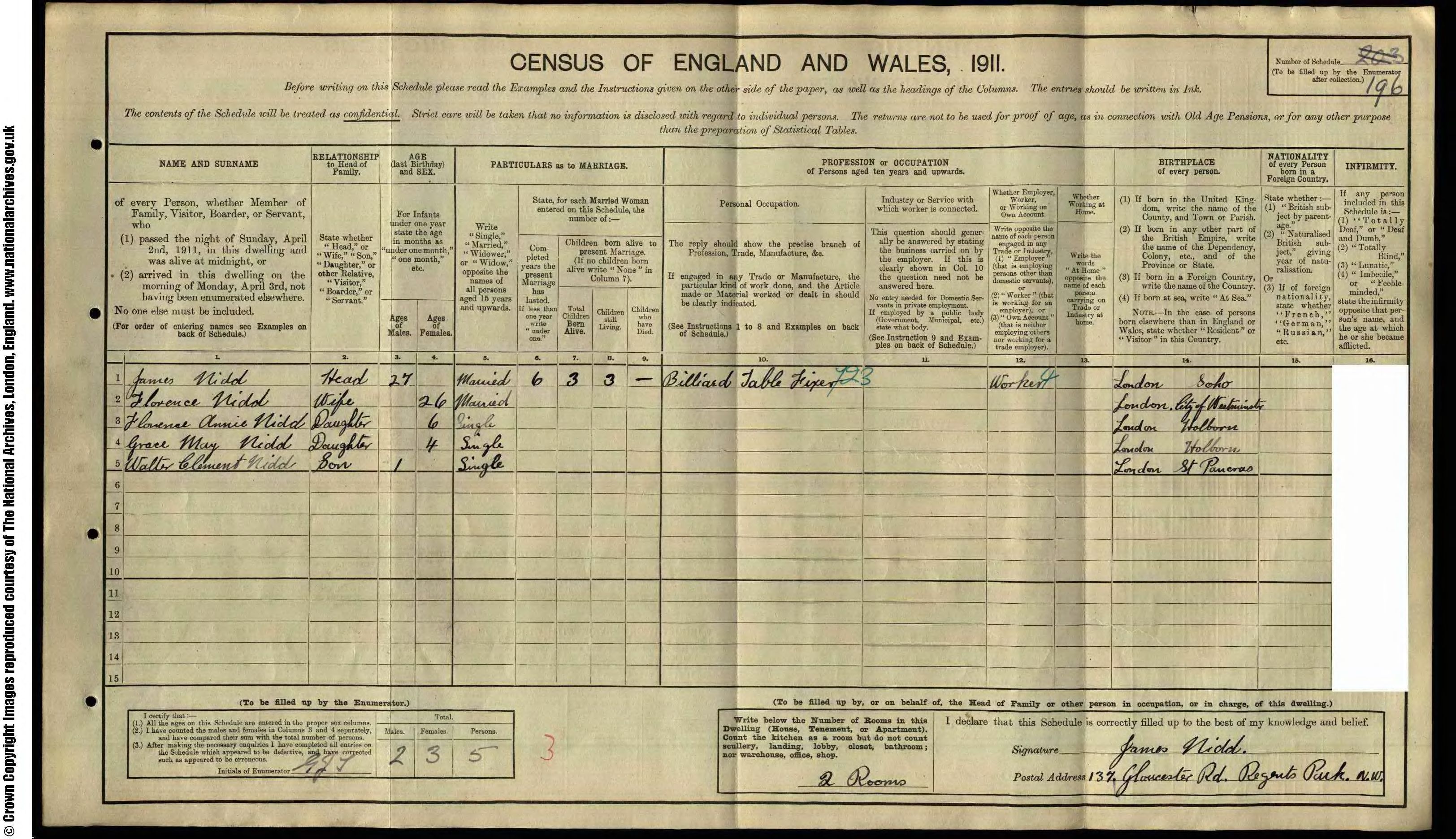 • Lived at: 137 Gloucester Road, 1911, Regents Park, London.