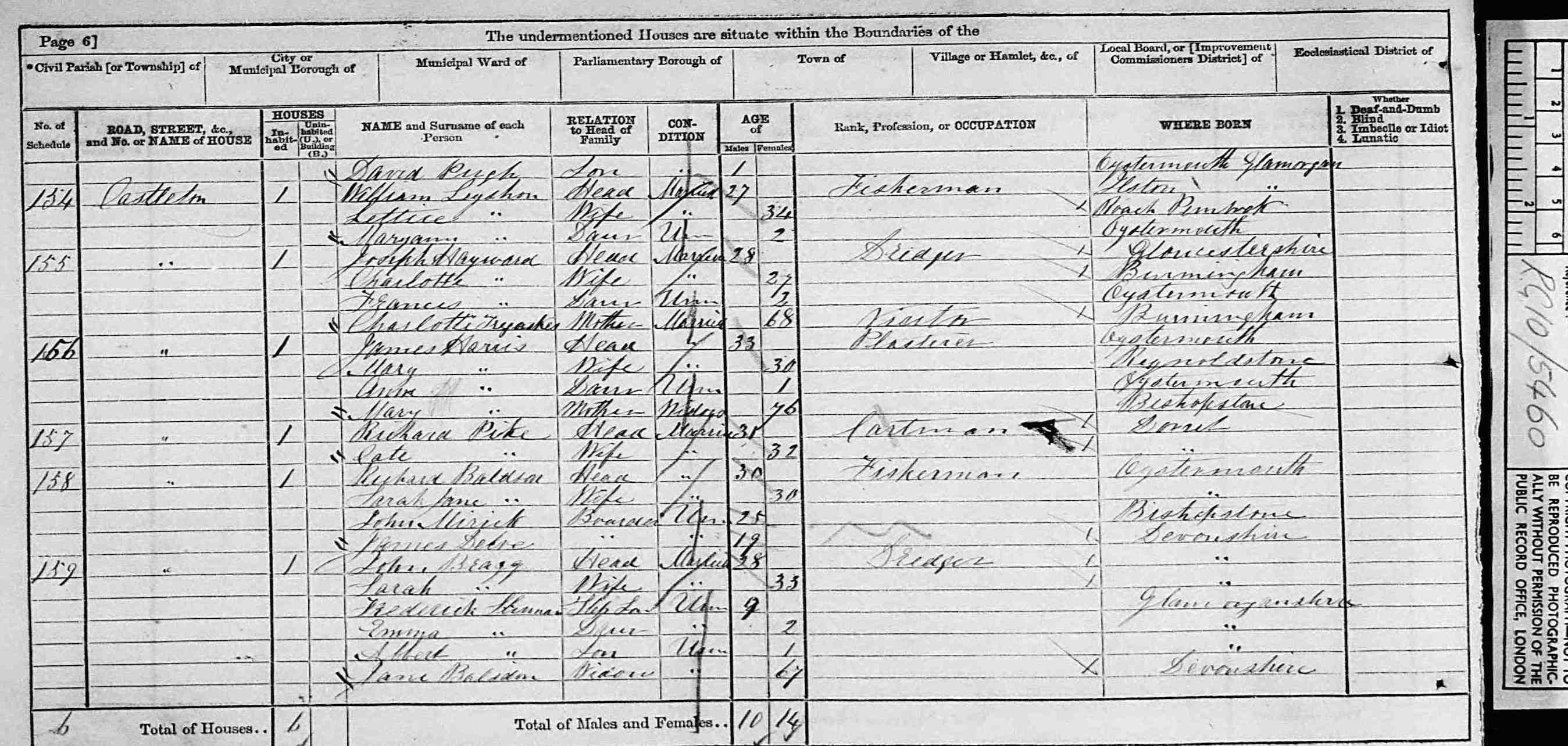 11 1881 census of Wales, Glamorgan, Oystermouth, page 36, James Harris and Family; digital images, Ancestry, Ancestry.co.uk (www.ancestry.co.uk : accessed 28 Aug 2011); citing PRO RG 11/5367. Cit. Date: 28 Aug 2011. Surety: 3.