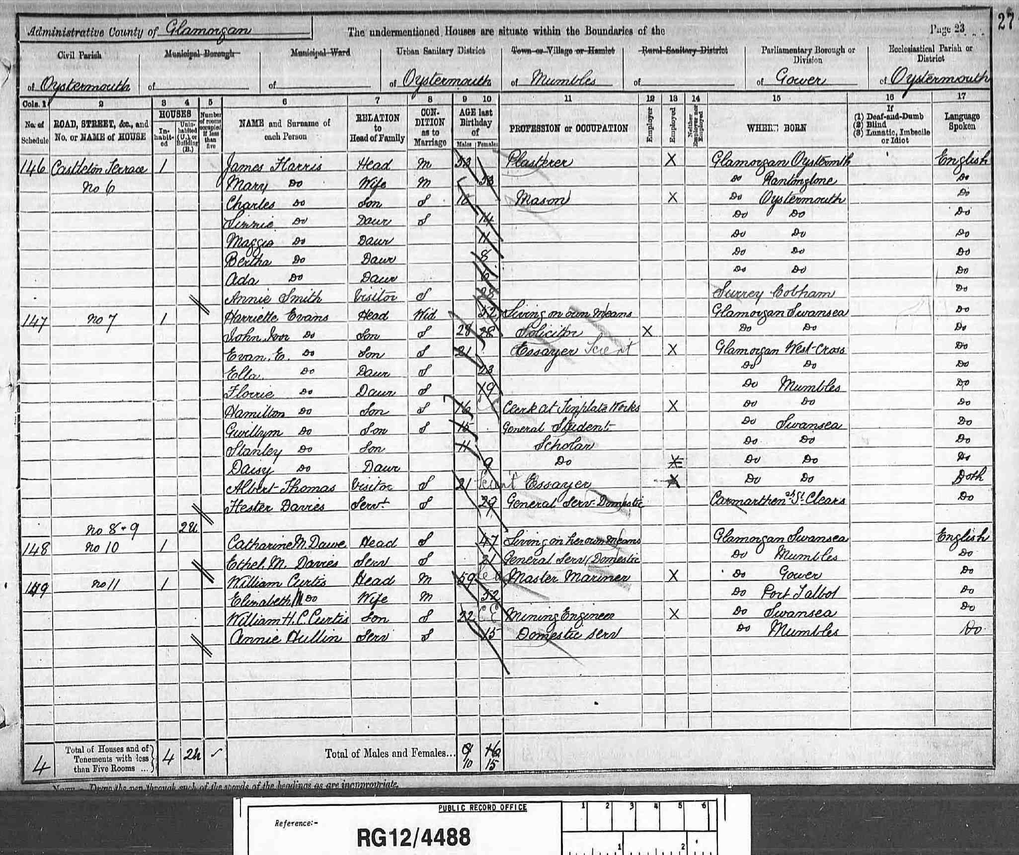 12 (1891 English and Welsh Census(London, TNA/Ancestry.co.uk, 1992) , Web site showing copies of original enumerator schedules) ID: CEN 1891 RG12, CEN 1891 Oystermouth rg12 4488 27 23. Cit. Date: 16 Feb 2005. Cit. ID: CEN 1891 Oystermouth rg12 4488 27 23. Surety: 3.