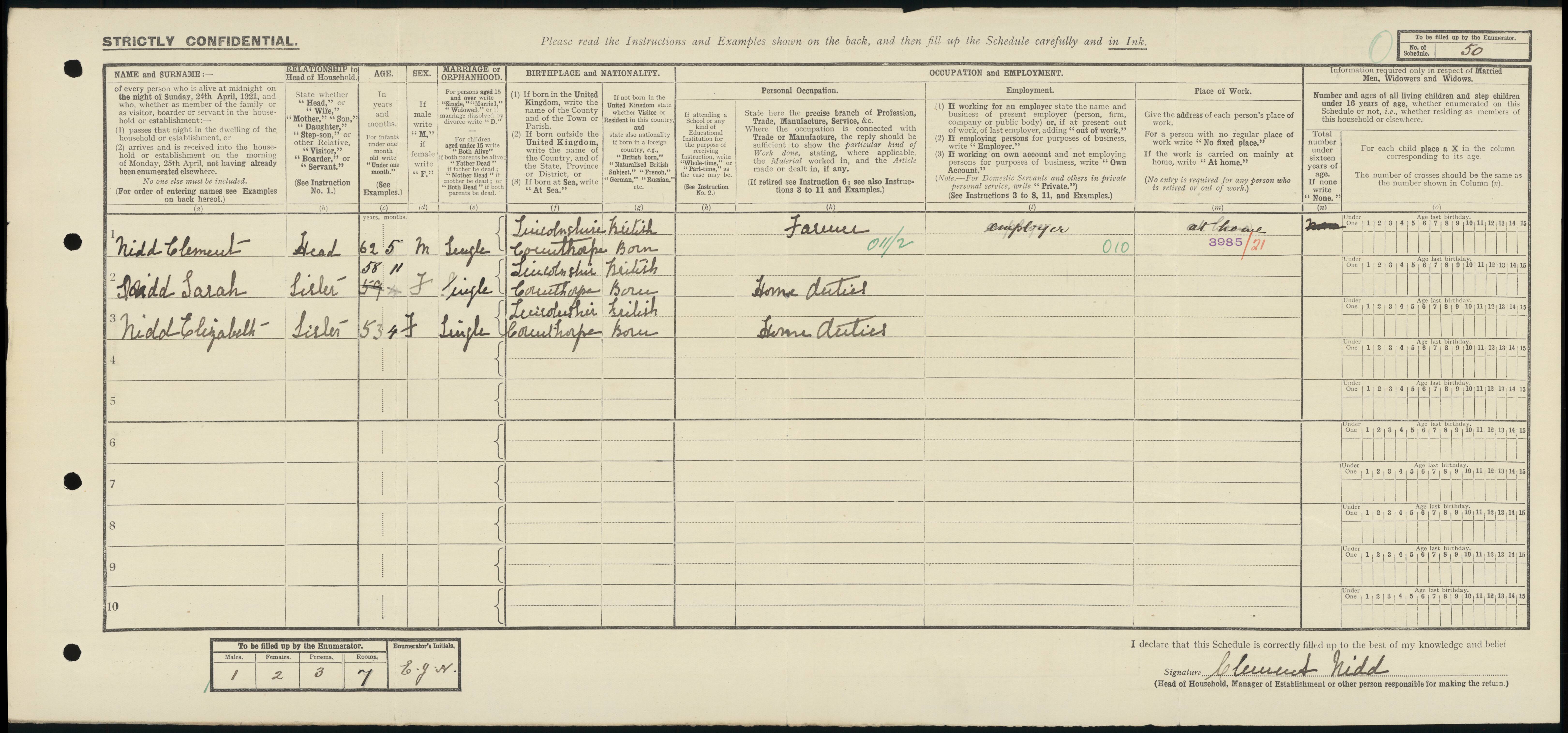 Elizabeth Nidd 1Death Notes: must have still been alive as she is referenced in her sister's obit Events • Lived at: Thorpe's Lodge, 1871, Counthorpe, Lincolnshire, England. 1 2 3 • Lived at: 69 Scotland, 1881, Ingoldsby, Lincolnshire, England. 1 4 • Lived at: Thorpe's Lodge, 1891, Eaton, Leicestershire, England. 3 • Lived at: Farm Lodge, 1901, Eaton, Leicestershire, England. 1