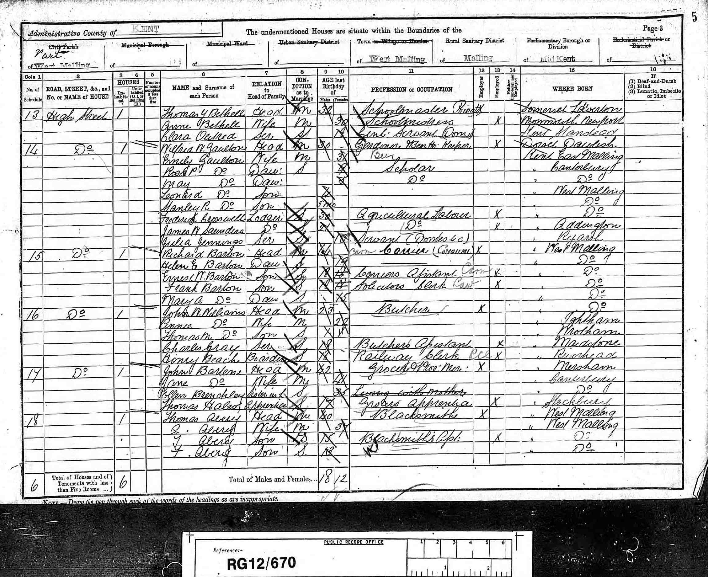• Occupation: Butcher, 1891, West Malling, Kent, England. 1