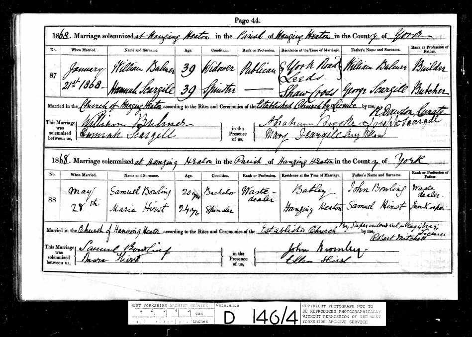 Events • Lived at: New Road, 1851, Batley, Yorkshire, England. 2 • Lived at: Wellington Street, 1861, Batley, Yorkshire, England. 1 • Lived at: Bromley Building, 1871, Southill, Dewsbury, Yorkshire, England. 3 • Occupation: Rag Dealer, 1871, Southill, Dewsbury, Yorkshire, England. 3 • Lived at: 27 Moreton Street, 1881, Cheetham, Manchester, Lancashire, England. 4 • Occupation: Rag Dealer employing 2 women, 1881, Cheetham, Manchester, Lancashire, England. 4 • Lived at: 3 Old Hall Road, 1891, Stockport Etchells, Cheshire. 5 • Occupation: Woollen Merchant, 1891, Stockport Etchells, Cheshire. 5 • Lived at: 2 Moira Street, 1901, North West Leicester, Leics. 6 • Occupation: Rag Dealer, 1901, North West Leicester, Leics. 6 Samuel married Maria Hirst on 28 May 1868 in Hanging Heaton. (Maria Hirst was born circa 1844 in Heaton, Yorkshire 4 6 and died after 1911 4 6.) |