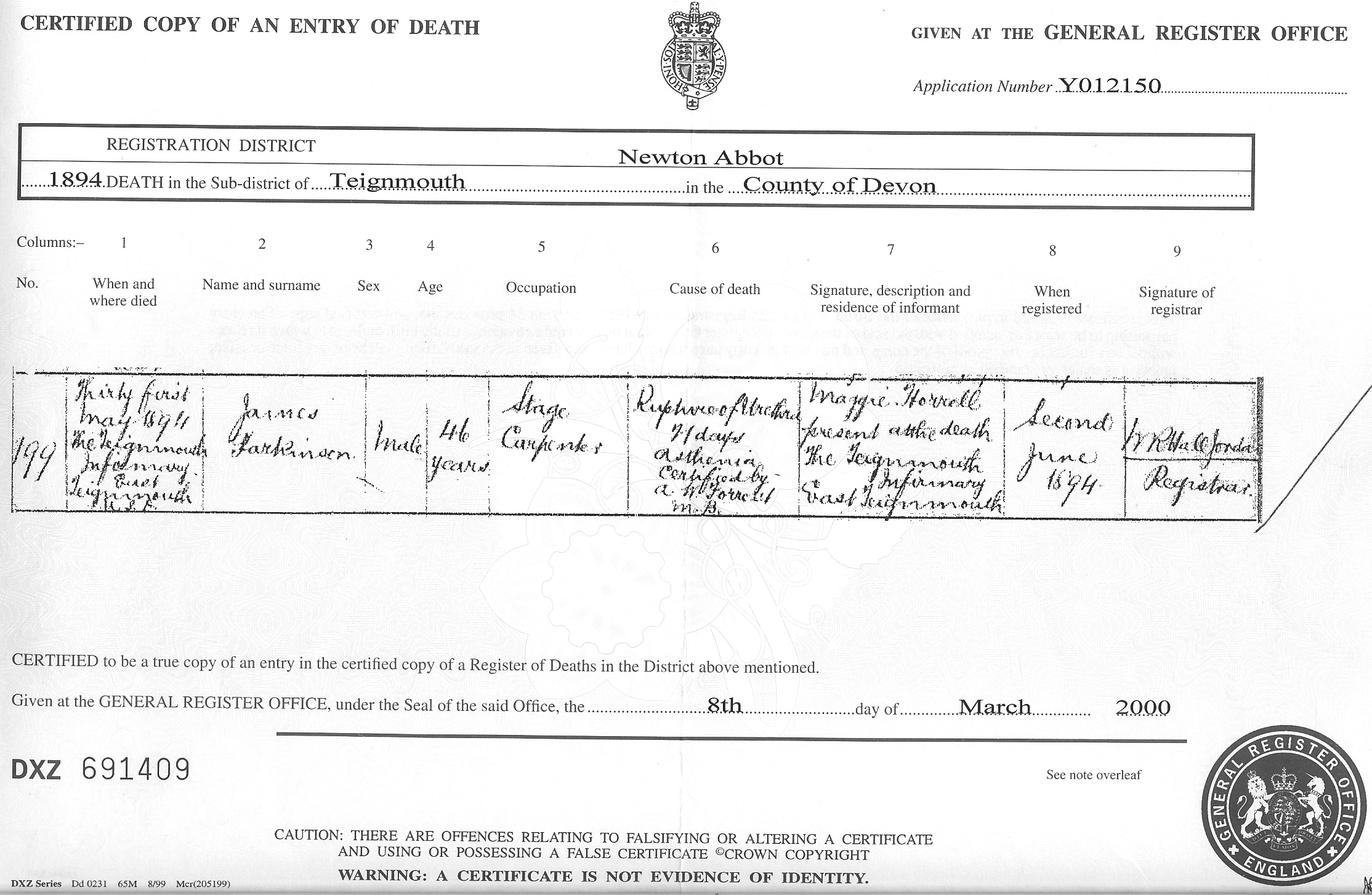 England and Wales, death certificate for James Parkinson, died Thirty First may 1894; citing 5b/74/199, June quarter 1894, Newton Abbot registration district, Teignmouth sub-district; General Register Office, Southport. Rec. Date: Jul 2008. ID: DC. Cit. Date: Mar 2000. Cit. ID: DXZ 691409, Surety: 4; Newton abbot