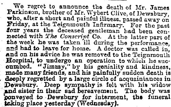 • Lived at: 8 Cliffe Street, 1891, Dewsbury, Yorkshire & Yorkshire (West Riding), England. 18 • Occupation: Theatre Propety Man, 1891, Dewsbury, Yorkshire & Yorkshire (West Riding), England. 18 8 Cliffe Street • Lived at: 4 Cliffe street, 1892, Dewsbury, Yorkshire & Yorkshire (West Riding), England. • Lived at: Prospect Street, 1893, Huddersfield, Yorkshire, England. 19