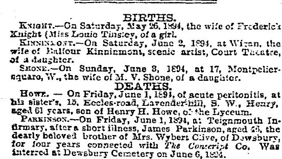 13 : Apr 2001. ID: WEB, WEB Page Gale Group 19th Century newspapers, The Era, Births, Deaths, Marriages and Obituaries The Era (London, England), Saturday, June 9, 1894; Issue 2907. Category: Birth, death, marriage notices. Surety: 2.