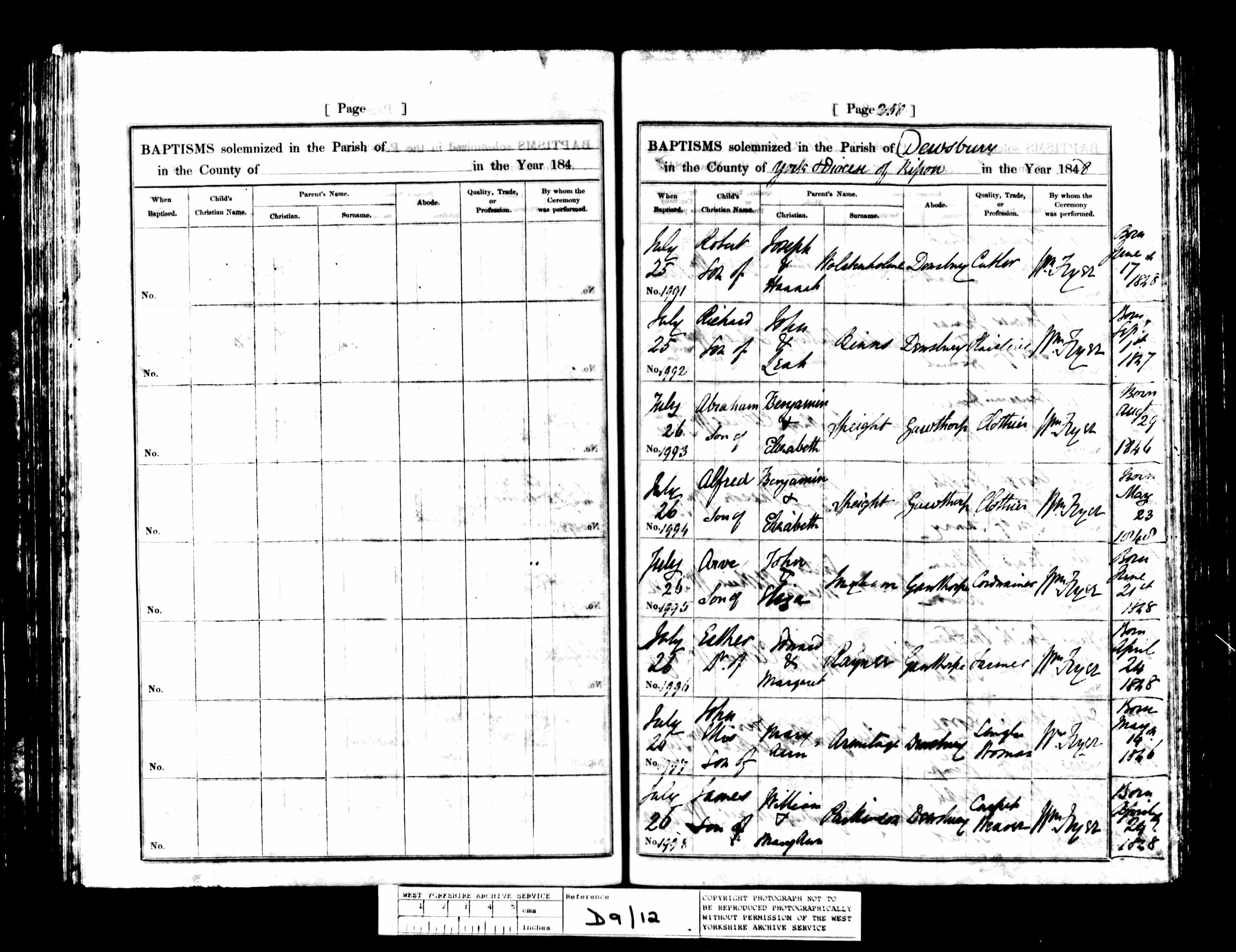 • Baptism Image: Parish Records, 1848, Dewsbury, Yorkshire, England.
