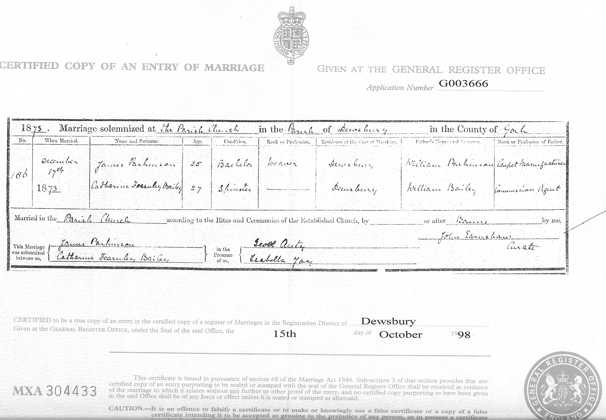 England and Wales, marriage certificate for James Parkinson and Catherine Fearnley Bailey, married December 17; citing 9b/1022/186, Dewsbury quarter 1873, Dewsbury registration district, Parish Church of Dewsbury in County of York sub-district; General Register Office, Southport. Cit. Date: Oct 1998. Cit. ID: MXA 304433, Surety: 4; 1873 parish church, Dewsbury, York