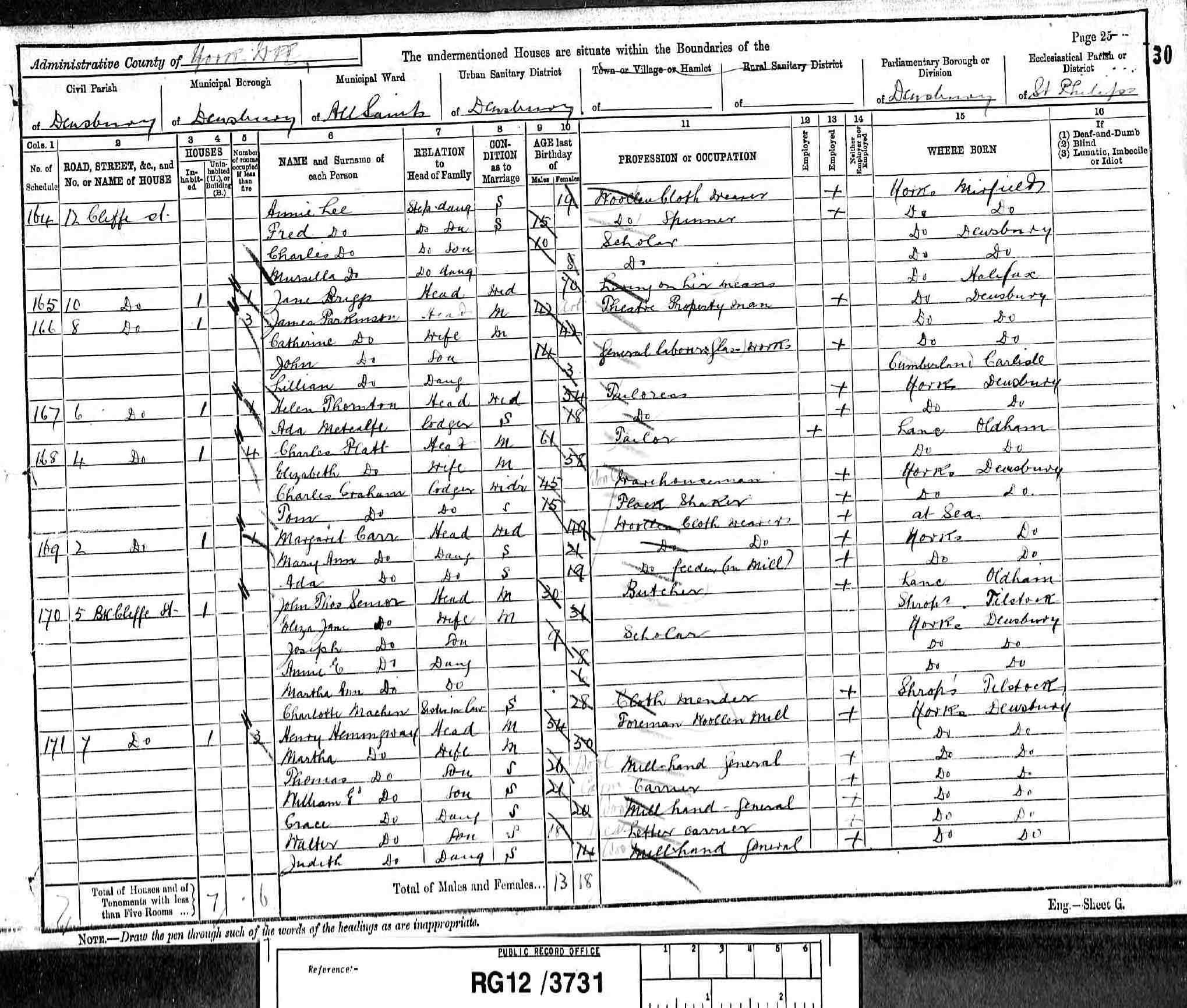 18 (1891 English and Welsh Census(London, TNA/Ancestry.co.uk, 1992) , Web site showing copies of original enumerator schedules) ID: CEN 1891 RG12, CEN 1891 rg12 3731 folio 30 page 25. Cit. Date: 5 Oct 2004. Cit. ID: CEN 1891 rg12 3731 folio 30 page 25 Dewsbury. Surety: 4.