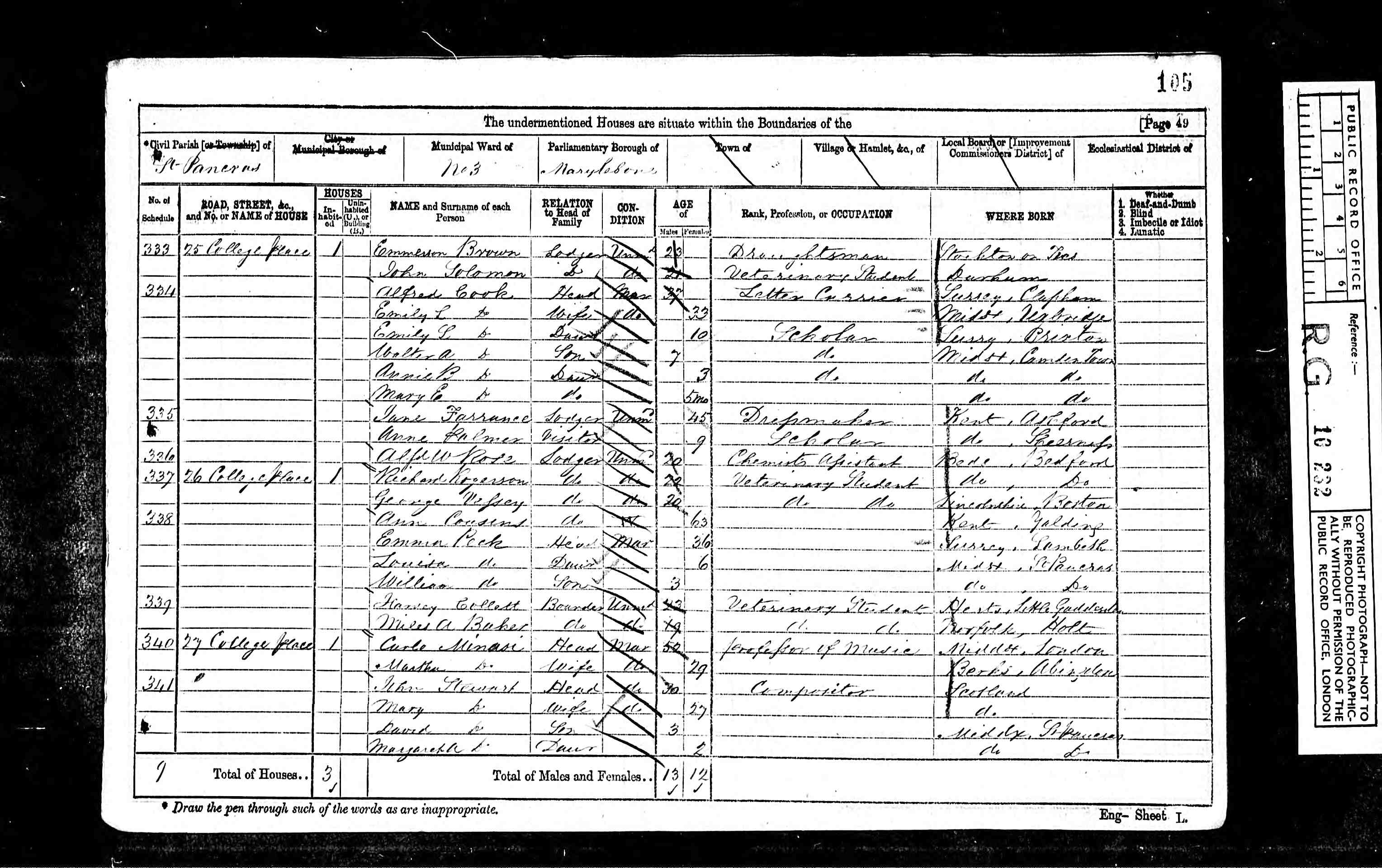 • Occupation: Veterinary Student, 1871, Camden Town, Pancras, London. 4 George married Ellen Newlyn Dec Q 1873 in Christchurch, Dorset. (Ellen Newlyn was born circa 1849 in Sturminster Newton, Dorset and died after 1911.) |