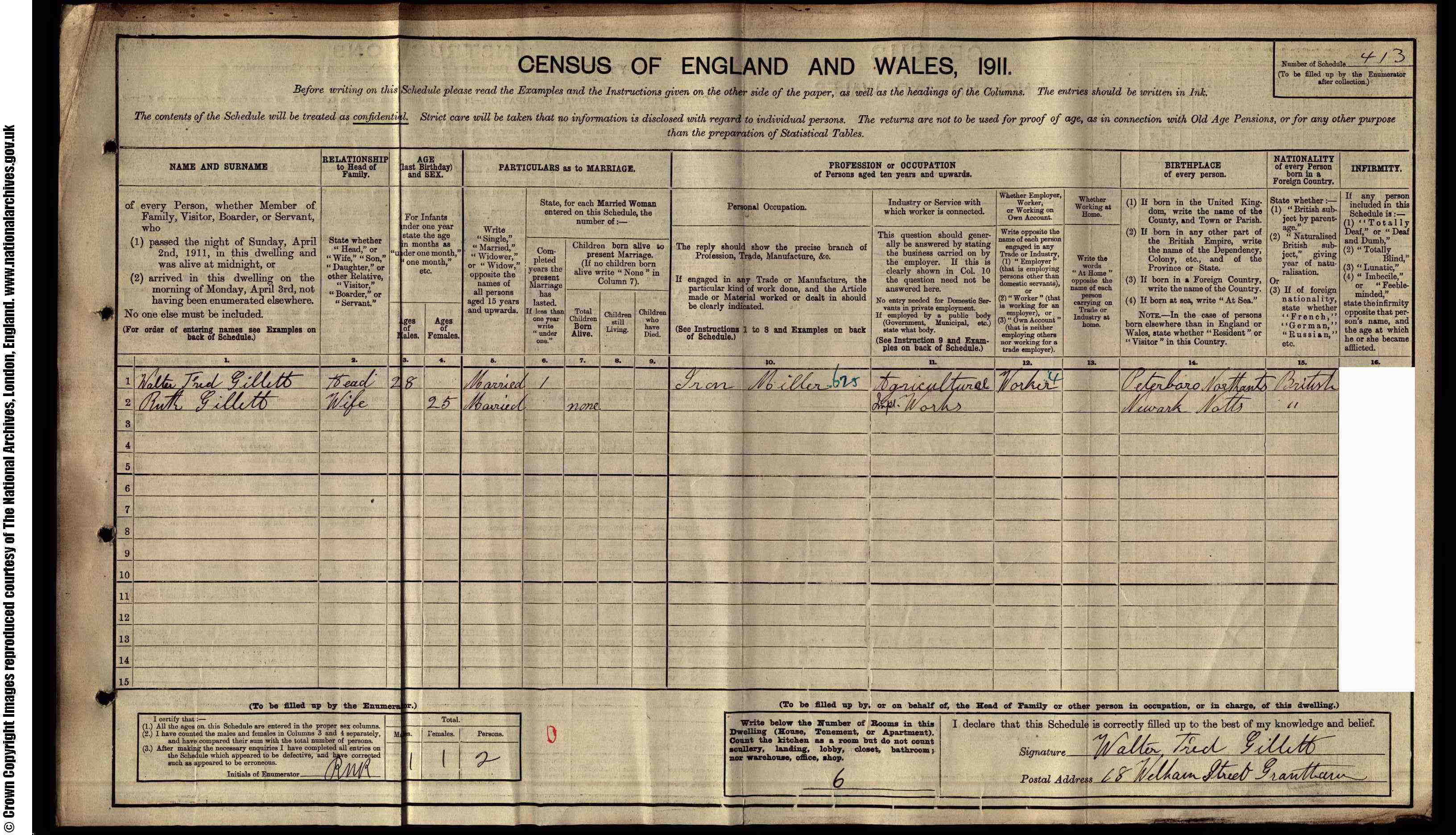 • Lived at: 68 Welham Street, 1911, Grantham, Lincolnshire, England. Ruth married someone Walter Fred Gillett Mar Q 1910 in Grantham, Lincolnshire, England. (Walter Fred Gillett was born in 1883 and died Dec Q 1912 in Grantham, Lincolnshire, England.) |