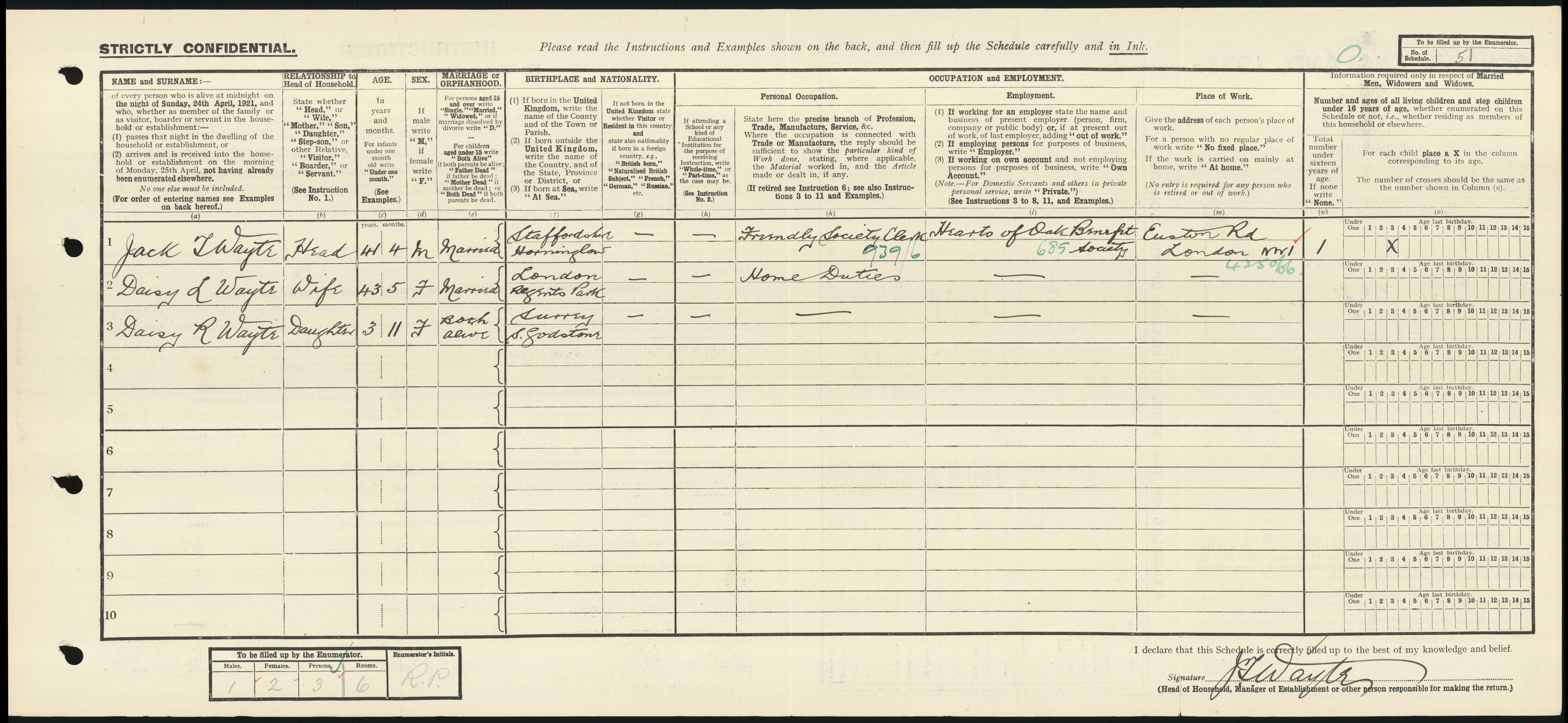 • Occupation: Needlework, Embroidery, 1939, Hampstead, London. Daisy married Jack T. Wayte Sep Q 1914 in St. Pancras. (Jack T. Wayte was born in 1882 and died Dec Q 1956 in Harrow, Middlesex, England.) |