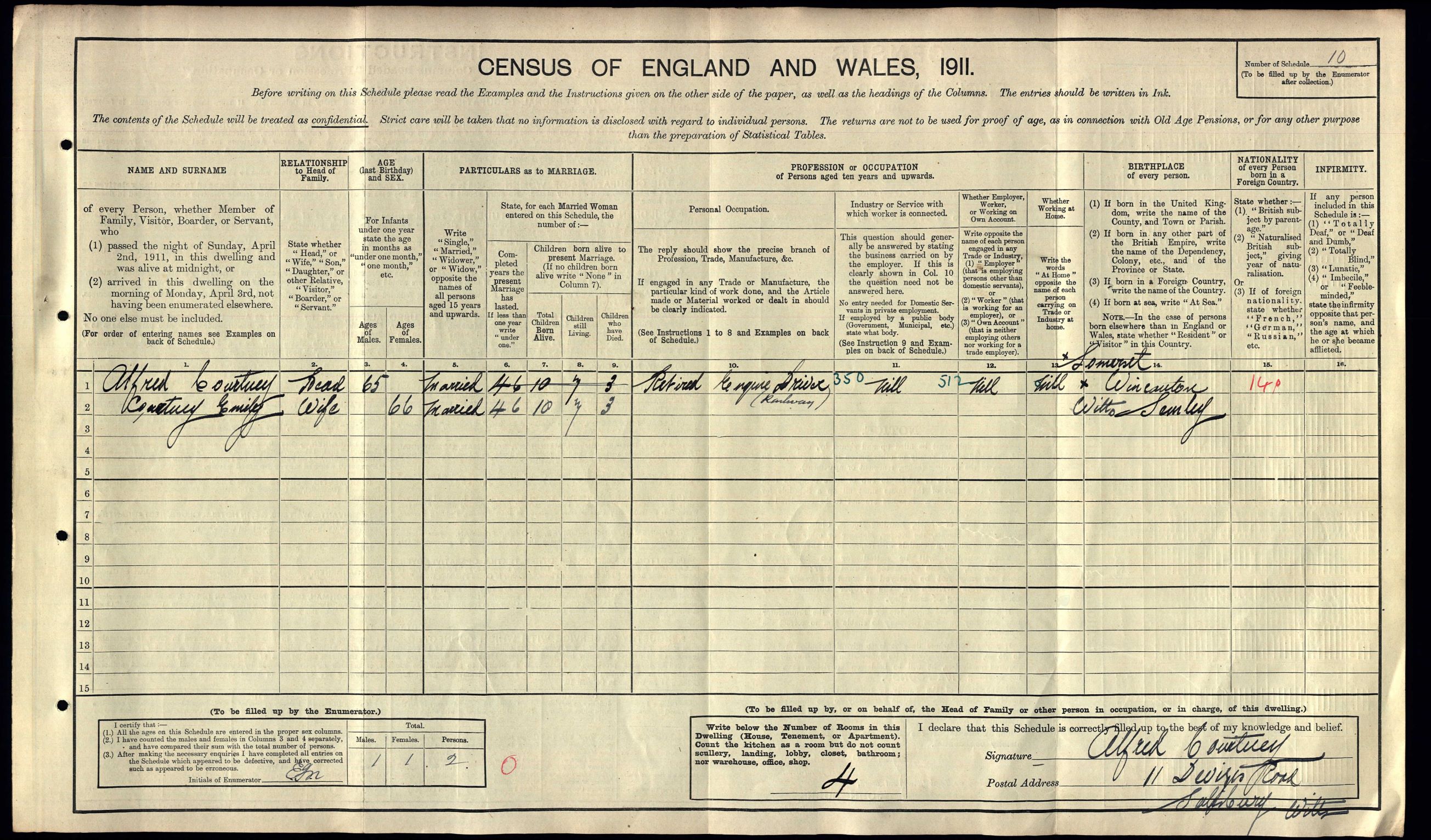 • Lived at: 11 Devizes Road, 1911, Salisbury, Wiltshire, England. Emily married Alfred Courtney on 4 Mar 1866 in Yeovil, Someset, England. (Alfred Courtney was born circa 1845 in Wincanton, Somerset, baptized on 22 Oct 1893 and died before 1939.) |