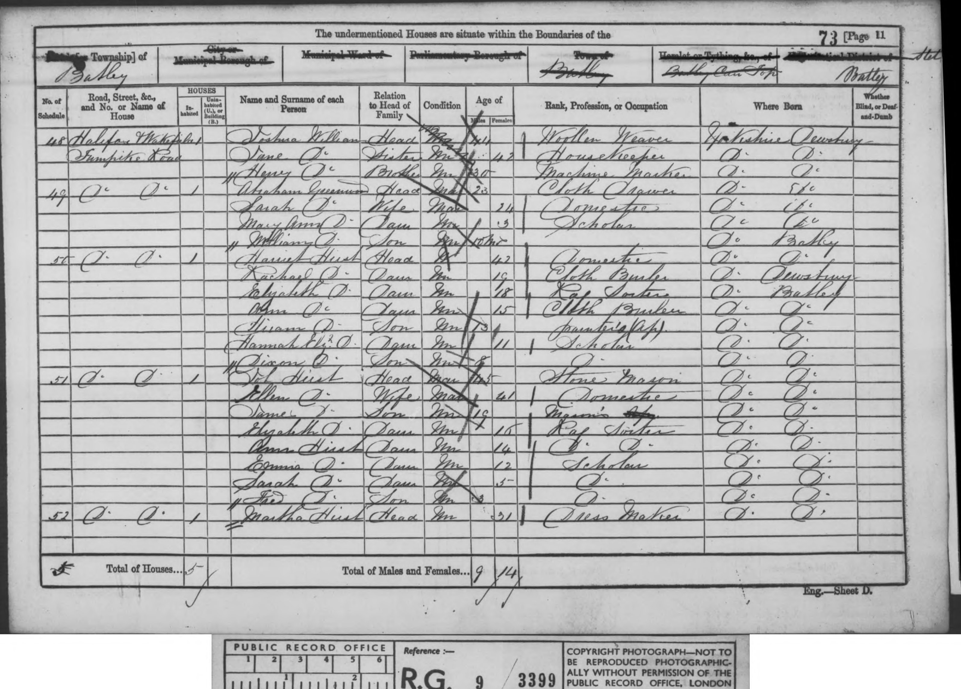 Death Notes: Name: Events • Lived at: Batley Carr Top, 1841, Batley, Yorkshire, England. • Lived at: Batley Carr, 1851, Batley, Yorkshire, England. 1 • Occupation: Mechanic, 1851, Batley, Yorkshire, England. 1