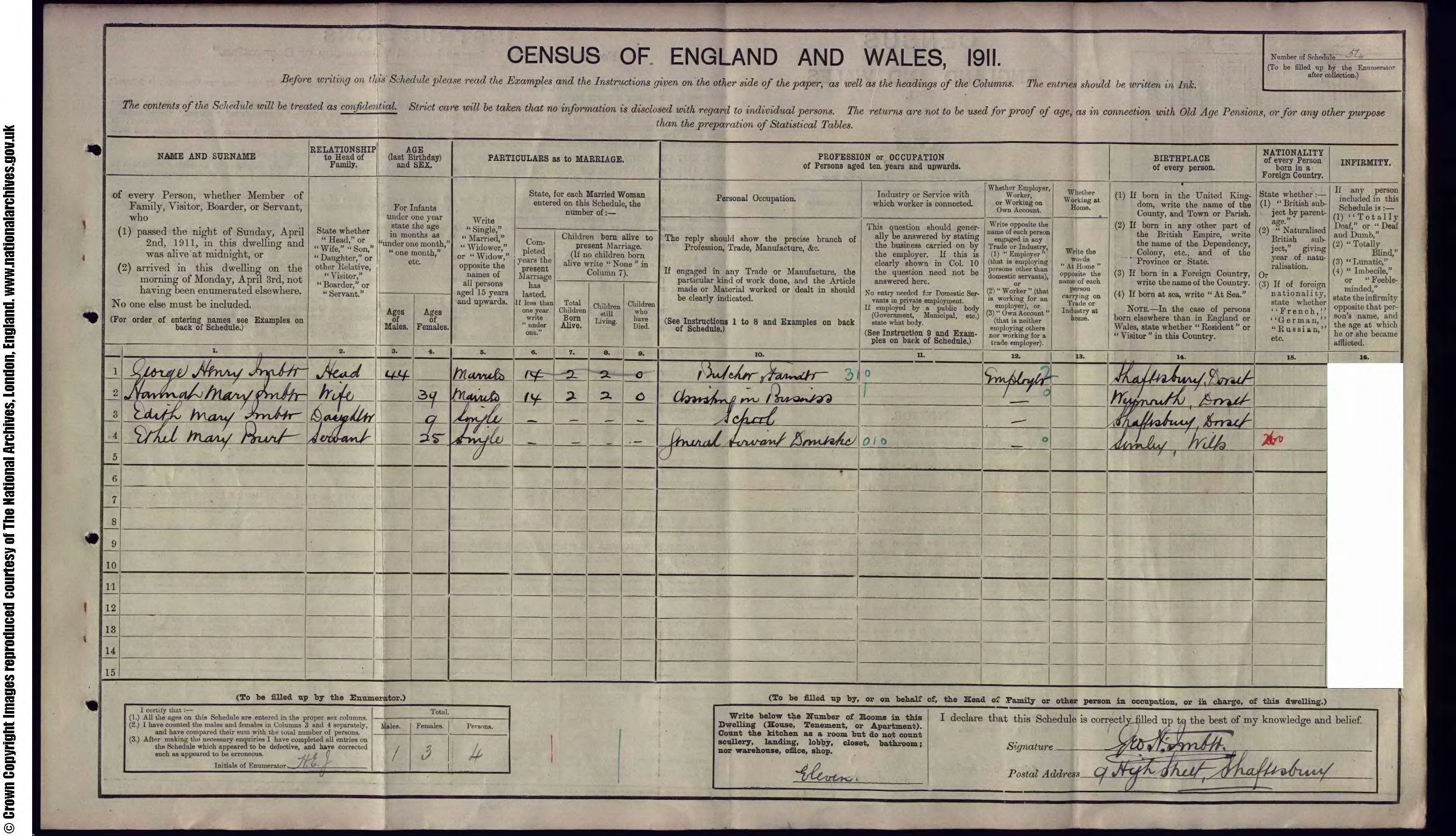 • Lived at: 9 High Street, 1911, Shaftesbury Holy Trinity, Dorset, England. • Occupation: Domestic Servant, 1911, Shaftesbury, Dorset, England.
