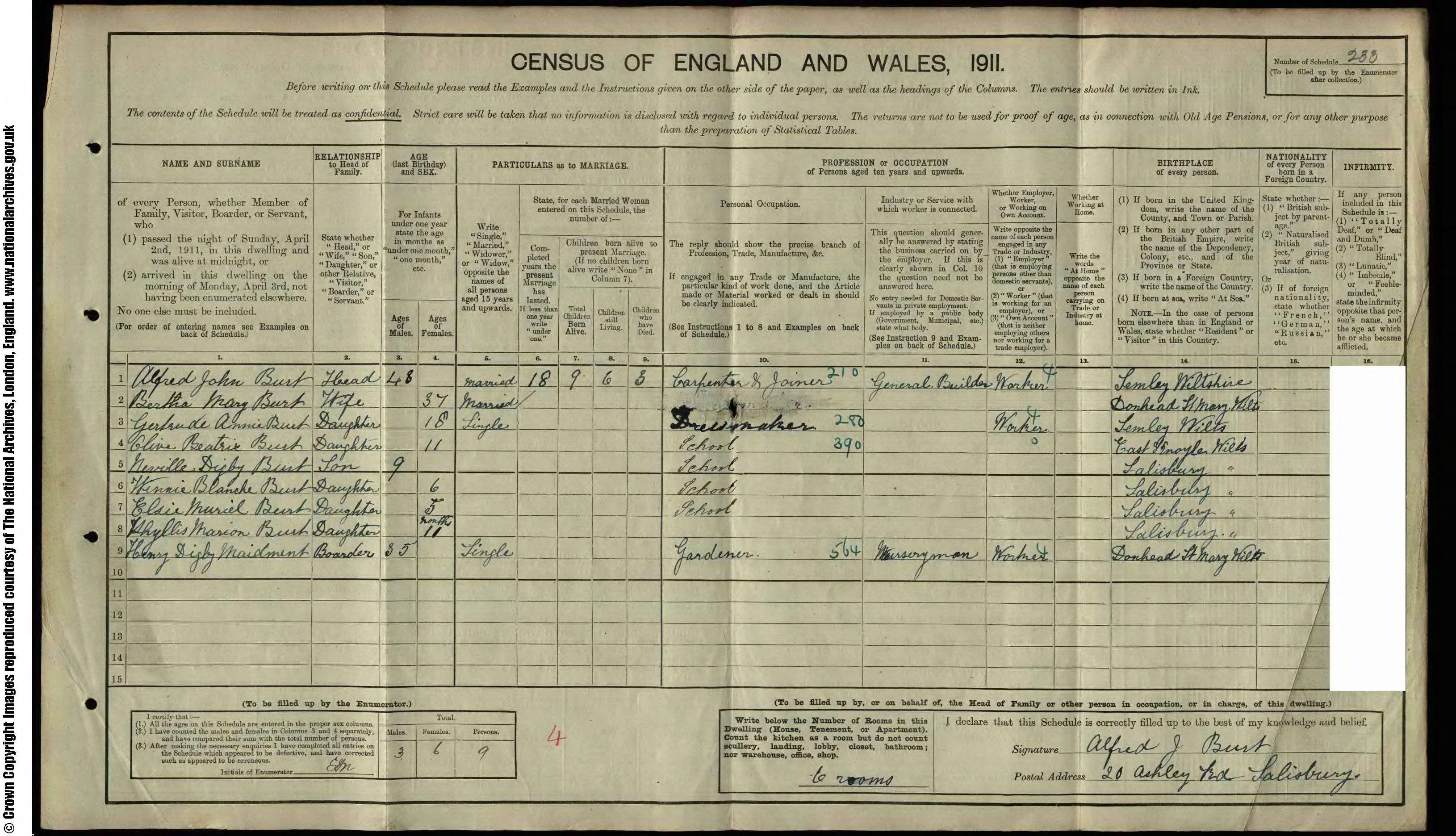 • Lived at: 20 Ashley Road, 1911, Salisbury, Wiltshire, England.