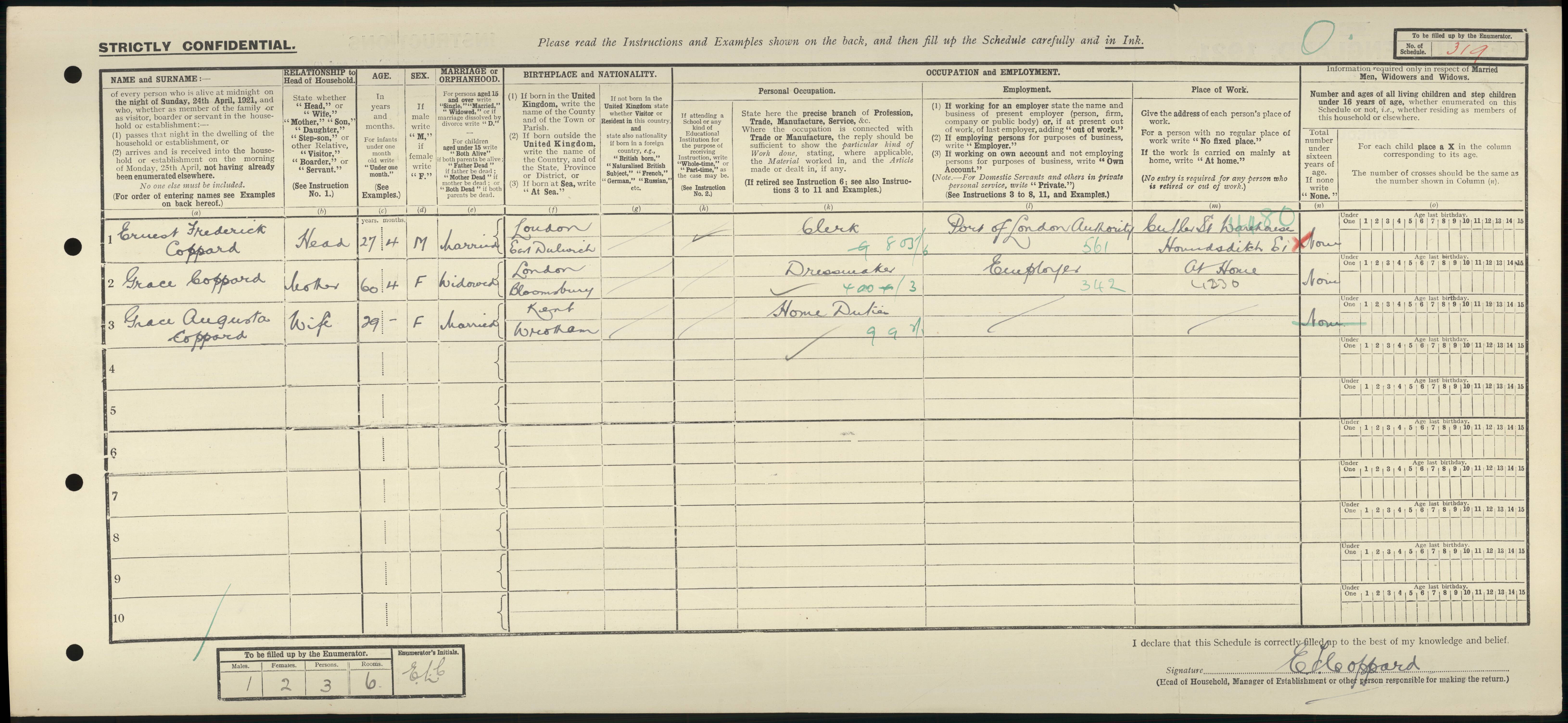 • Lived at: 9 Hindmans Road, 1921, East Dulwich, Camberwell, London & Surrey, England. Grace married Ernest F. Coppard Dec Q 1917 in Camberwell, Surrey, England. (Ernest F. Coppard was born on 4 Feb 1894 in East Dulwich, Camberwell, London & Surrey, England and died in Apr 1988 in Tunbridge, Kent, England.) |
