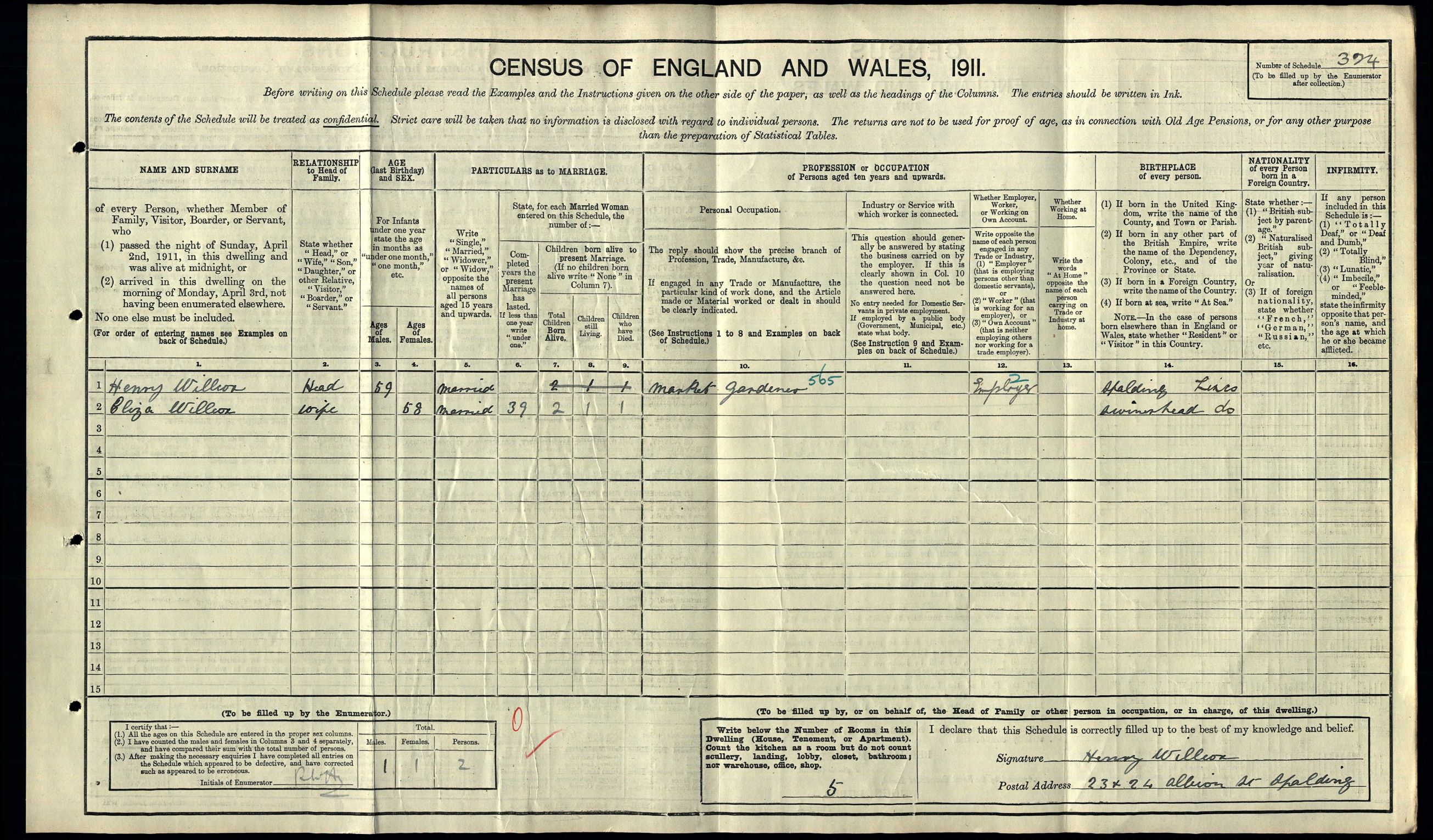 • Lived at: 23 and 24 Albion St, 1911, Spalding, Lincolnshire, England. Eliza married Henry Wilcox circa 1872. (Henry Wilcox was born circa 1852.) |