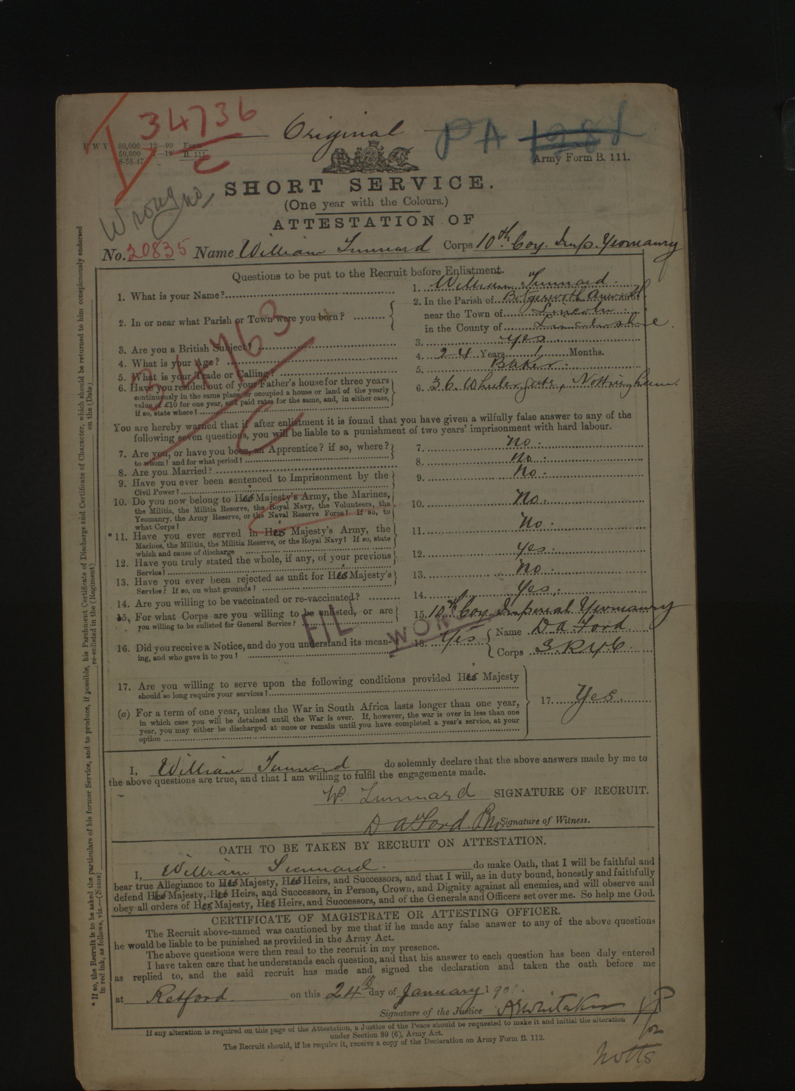 • Military: Attested, 21 Jan 1901, Retford, Nottingham. • Military: Discharge, 1 Sep 1902, Shorncliff, Kent Eltham. medically unfit but no specific injuries noted. |