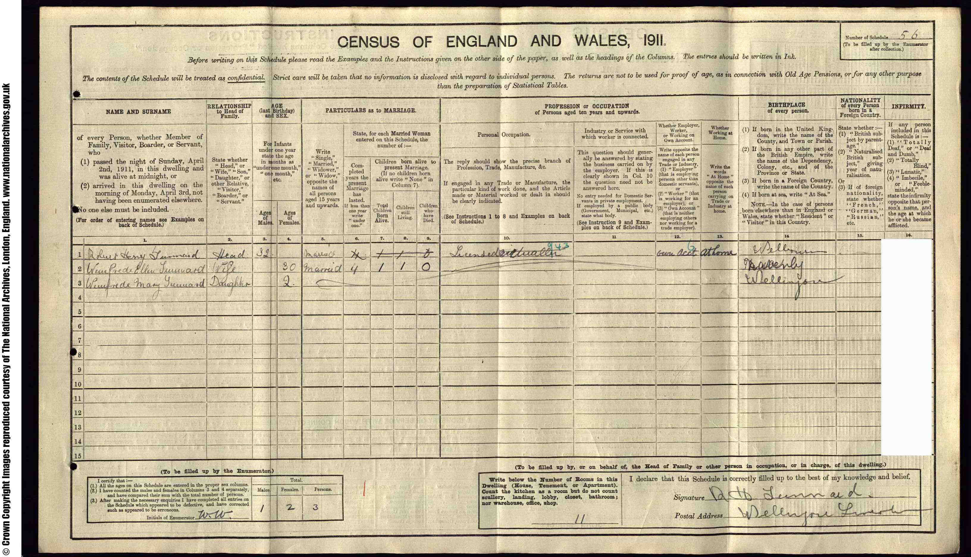 • Lived at: Wellingborough, 1911, Lincolnshire, England. • Lived at: Marquis of Granby Inn, 1921, Wellingborn Lincolnshire. Robert married Winifred Ellen circa 1907. (Winifred Ellen was born circa 1881 and died after 1911.) |