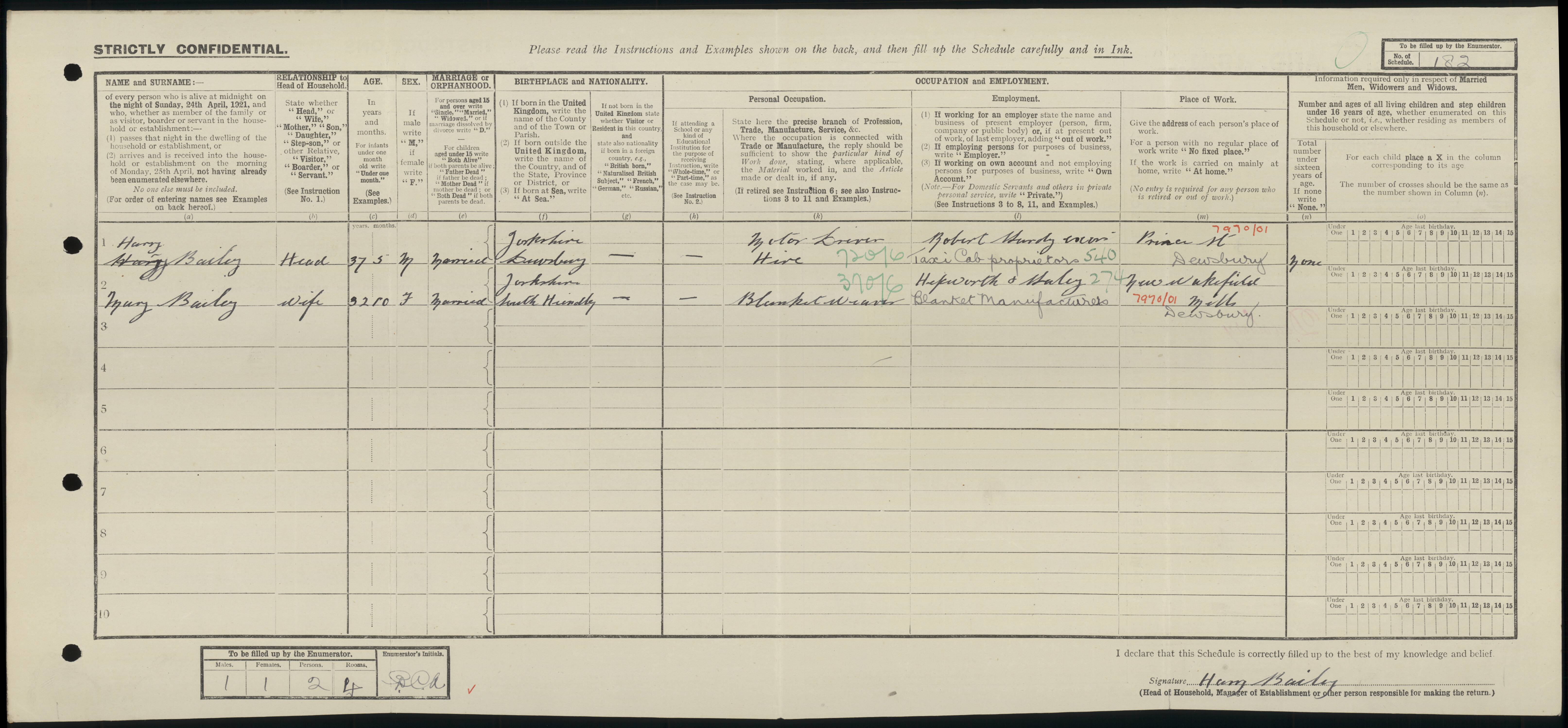 1911 census of England, Yorkshire, Cliffe Street, Dewsbury, Yorkshire, Charles Bailey and Family; digital images, 1911 Census .co.uk(http://www.1911census.co.uk : accessed 15 Jan 2009); citing RG 78 PN PN1594, RG 14 PN PN27860, registration district (RD) RD510, sub district (SD) SD1, enumeration district (ED) ED12, schedule number (SN) SN222. Cit. Date: 15 Jan 2009. Cit. ID: CENSUS 1911, Surety: 3; BAILEY JOHN (RG14PN27860 RG78PN1594 RD510 SD1 ED12 SN222)