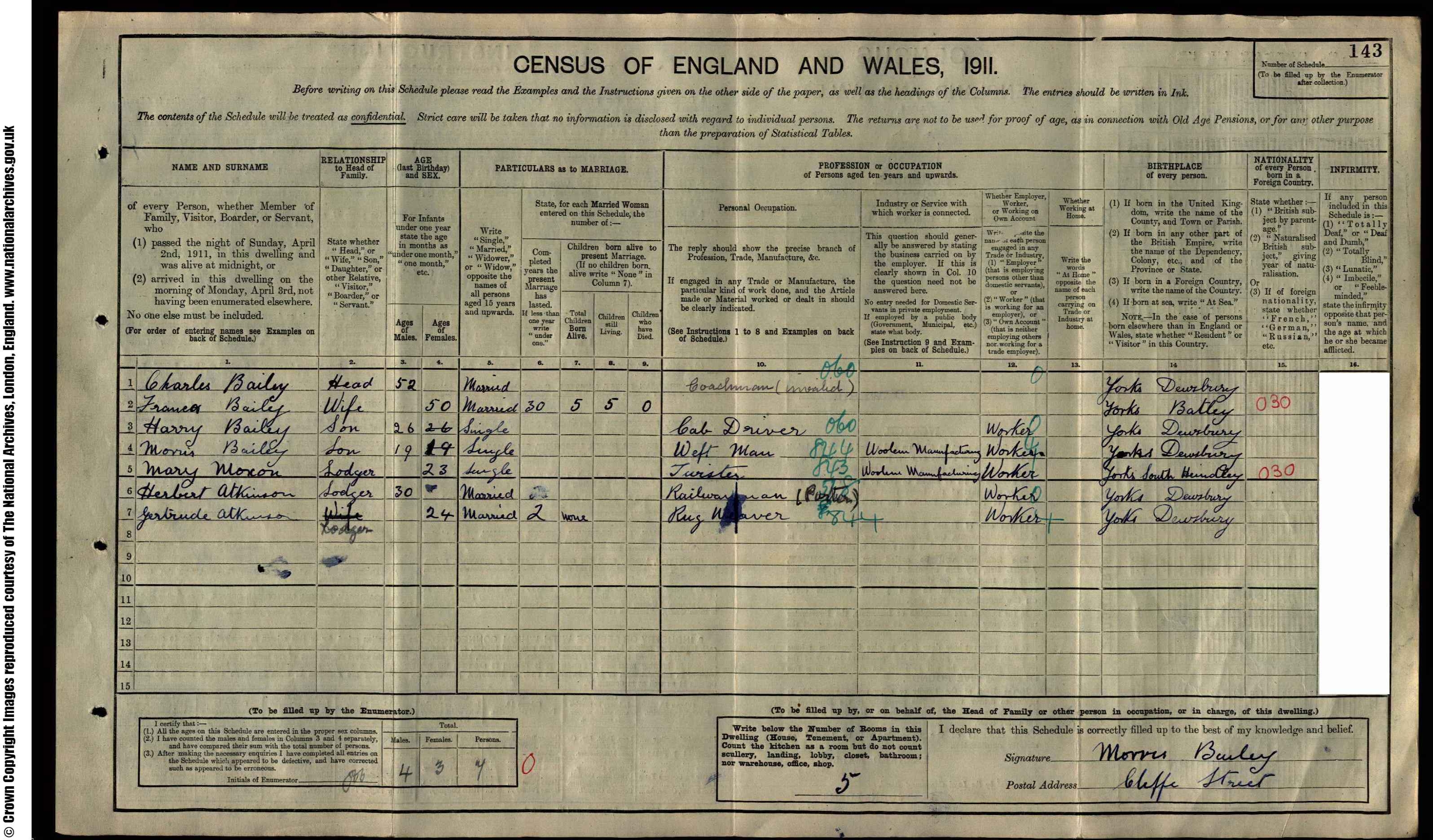 1911 census of England, Yorkshire, Cliffe Street, Dewsbury, Yorkshire, Charles Bailey and Family; digital images, 1911 Census .co.uk(http://www.1911census.co.uk : accessed 15 Jan 2009); citing RG 78 PN PN1594, RG 14 PN PN27860, registration district (RD) RD510, sub district (SD) SD1, enumeration district (ED) ED12, schedule number (SN) SN222. Cit. Date: 15 Jan 2009. Cit. ID: CENSUS 1911, Surety: 3; BAILEY JOHN (RG14PN27860 RG78PN1594 RD510 SD1 ED12 SN222)