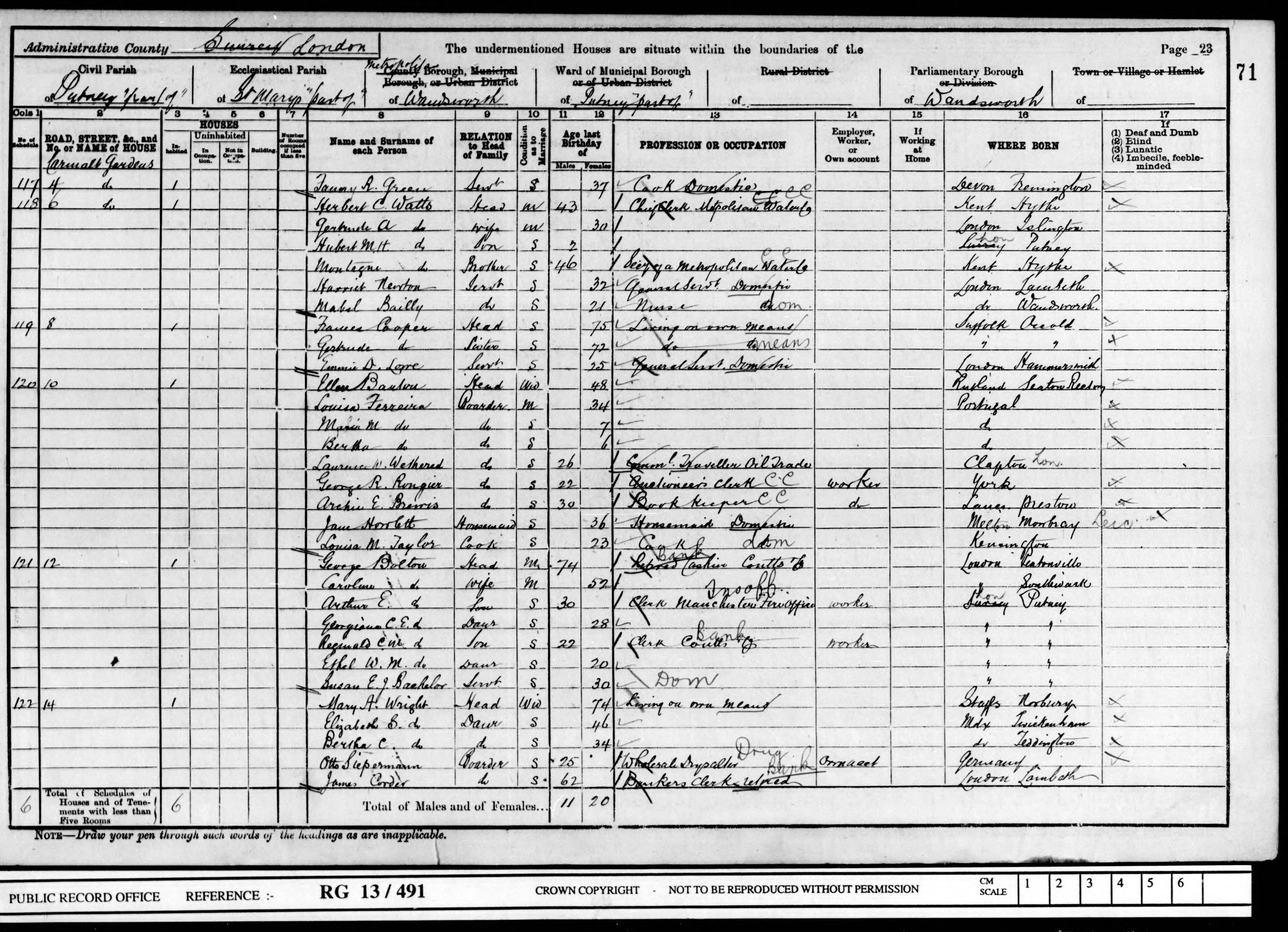 • Lived at: 12 Carmalt Gardens, 1901, Putney, Surrey, England. • Occupation: Cook, 1901, Putney, Surrey, England. |