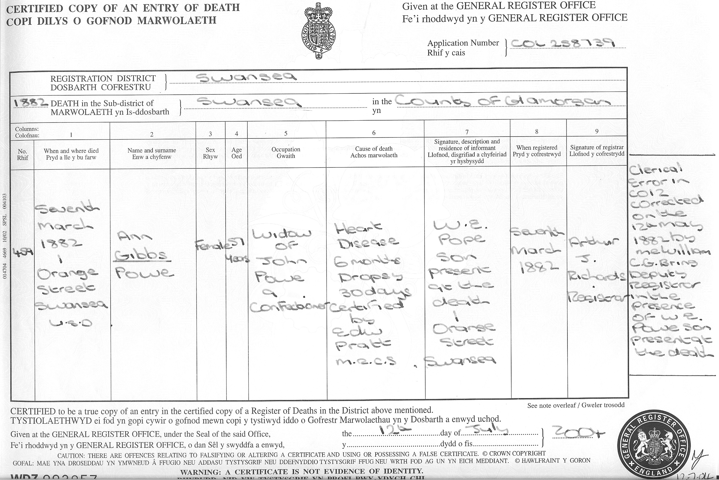13 (Record of Death(GRO) , Certificate) ID: DC, DEA wdz003257. Cit. Date: 21 Jul 2004. Cit. ID: DEA wdz003257 1882. Surety: 4.