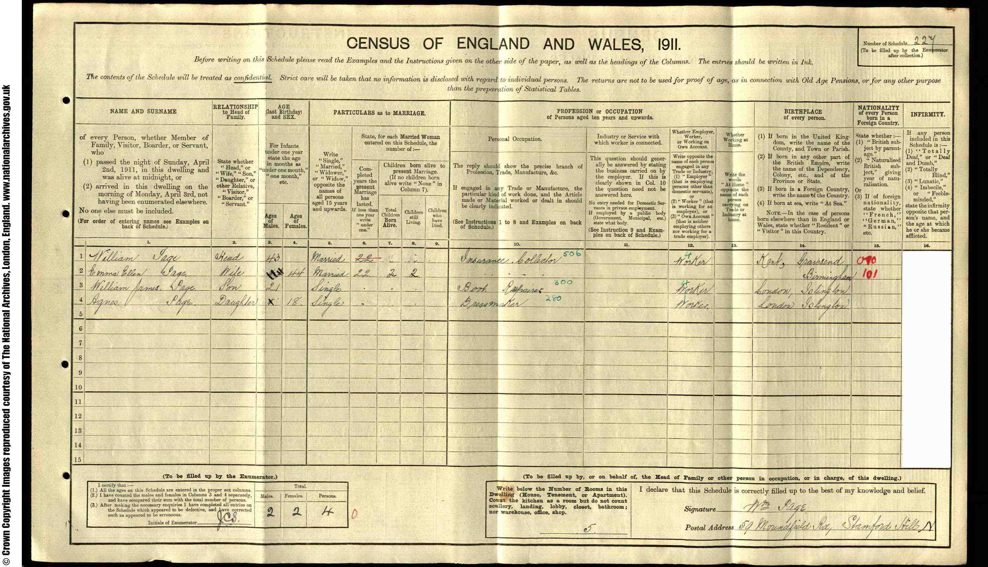 • Occupation: Insurance Collector, 1911, Stamford Hill. • Employer: Liverpool VIctoria Friendly Society, 1921, Tottenham, Middlesex, England.