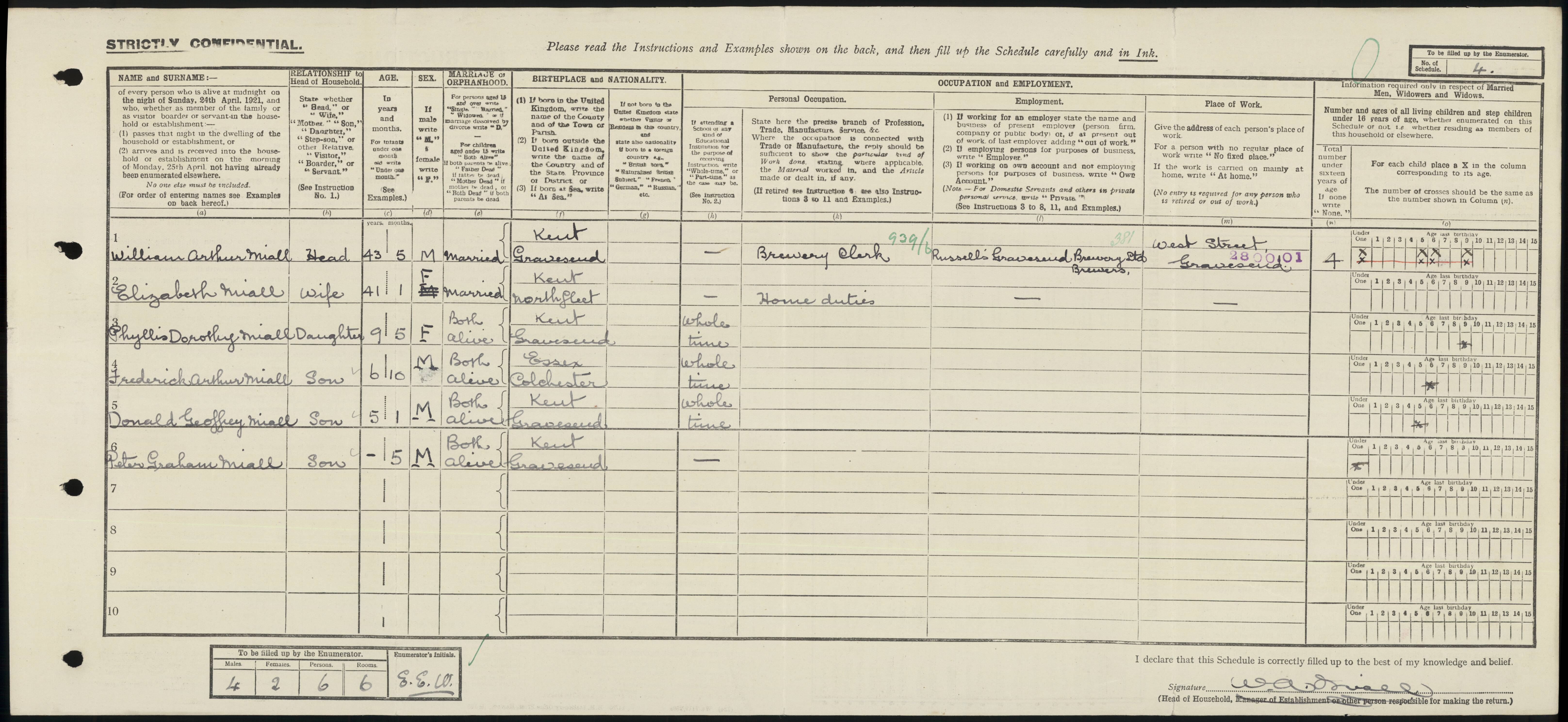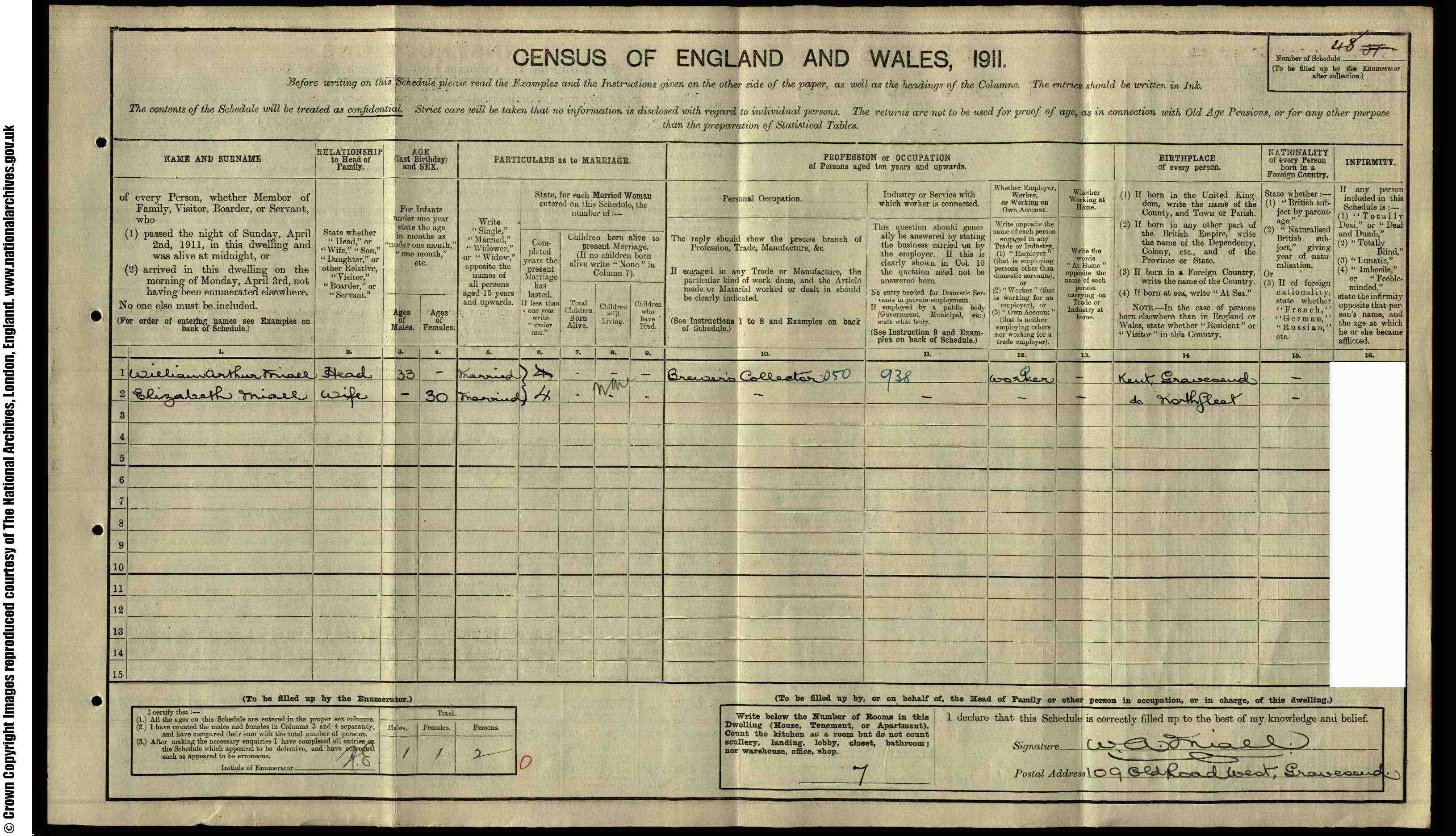1901 census of England, Kent, Gravesend, folio 62, page 7, William and Ann Miall; digital images, Ancestry, Ancestry.co.uk (www.ancestry.co.uk : accessed 21 Feb 2009); citing PRO RG 13/711. Cit. Date: 21 Feb 2009. Surety: 4.