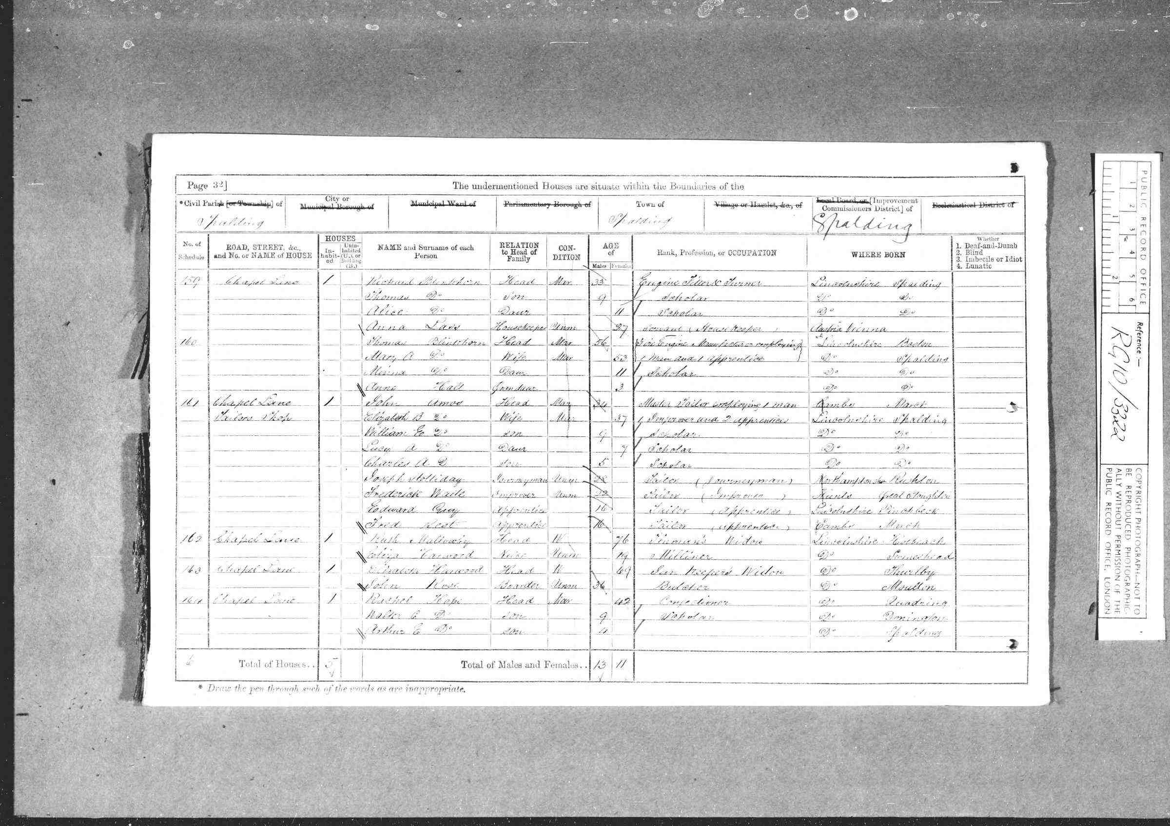 • Lived at: Chapel Lane, 1871, Spalding, Lincolnshire, England.