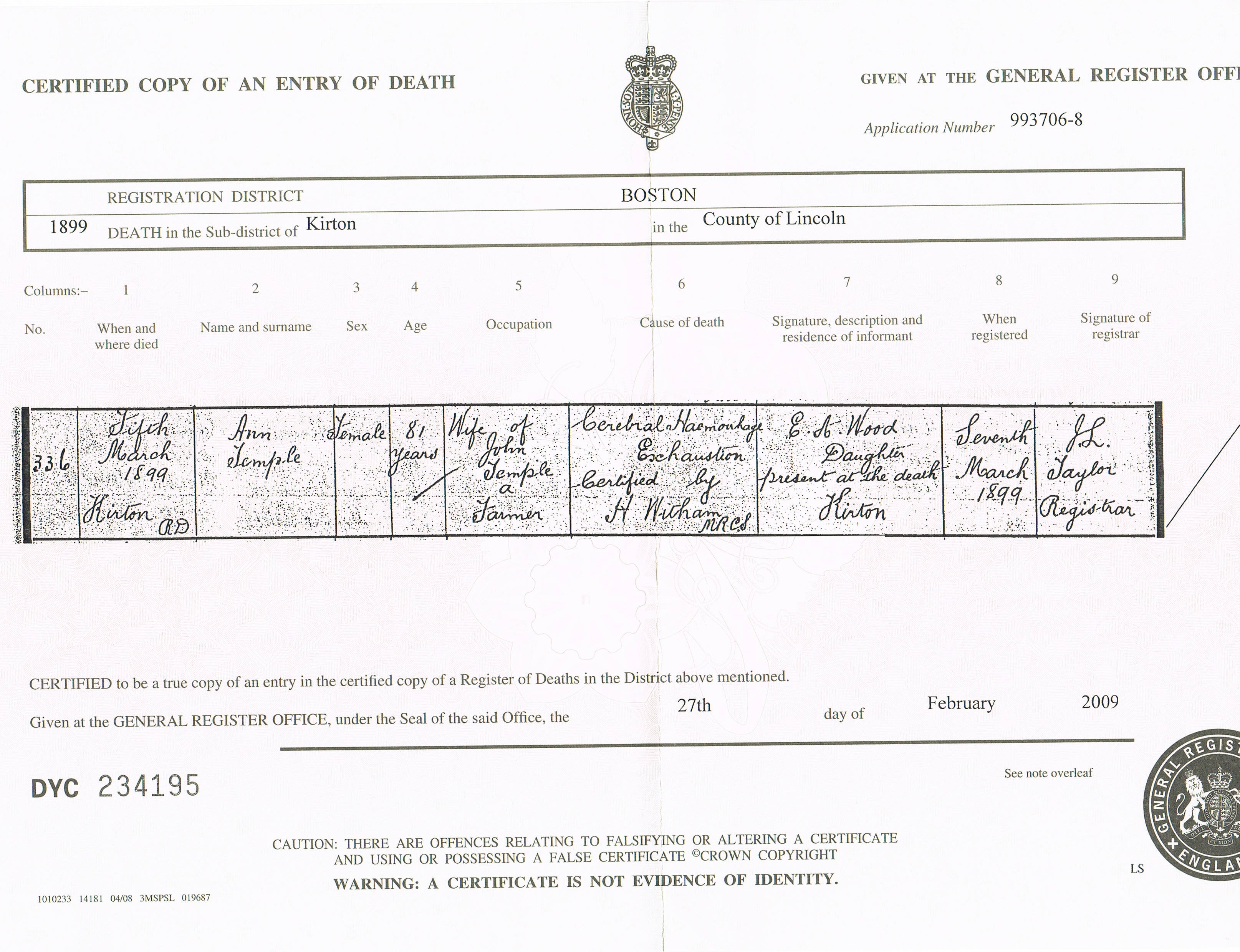 5 England and Wales, death certificate for Ann Temple, died Fifth March 1899; citing /336, March 1899 quarter, Boston registration district, Kirton sub-district; General Register Office, Southport. Rec. Date: Jul 2008. ID: DC. Cit. Date: 9 Mar 2009. Cit. ID: DYC234195, Surety: 4.
