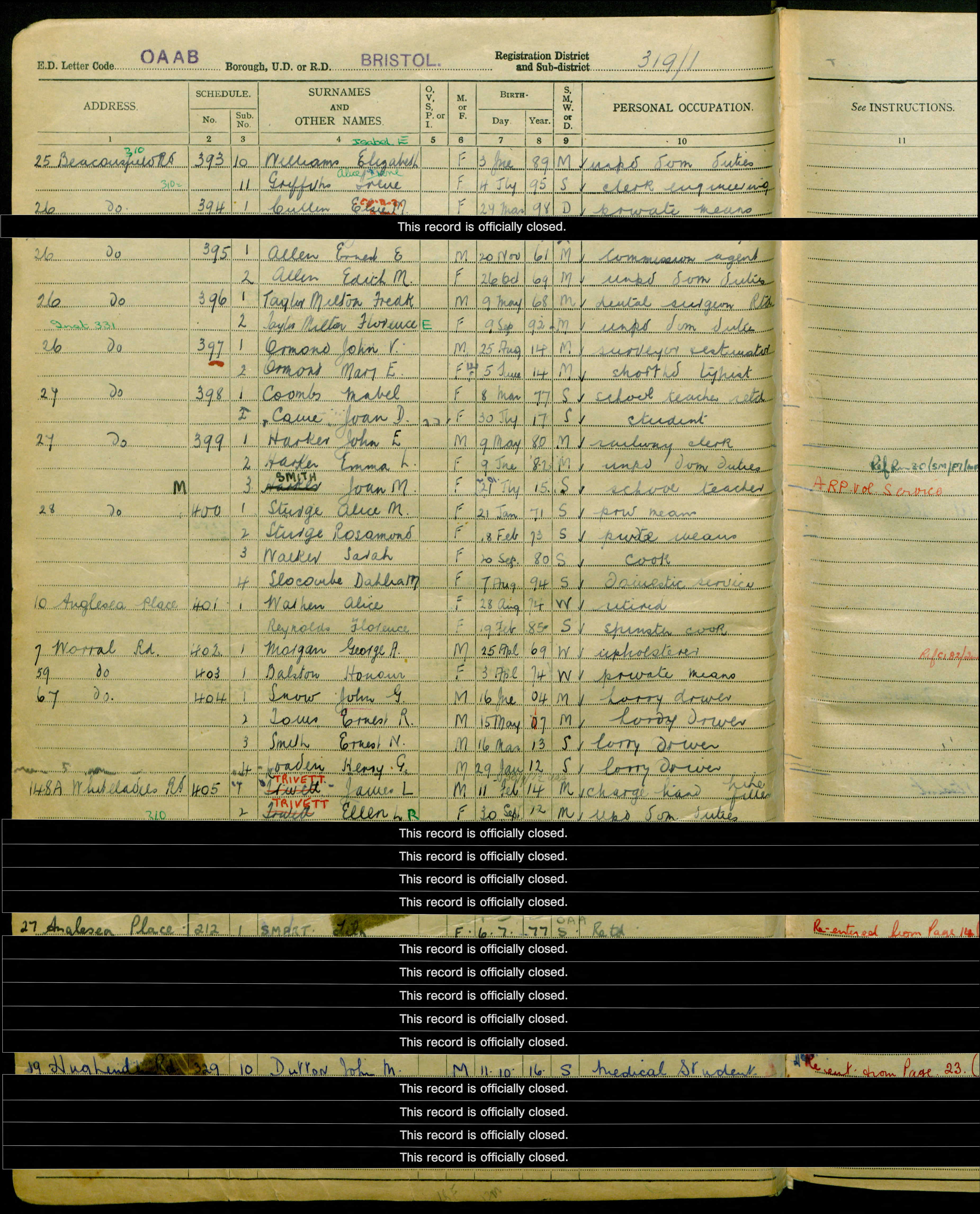 • Occupation: Surveryor's Estimator, 1939, Bristol, Gloucestershire, England. • Lived at: 36 Beaconsfield Road, 1939, Bristol, Gloucestershire, England. John married Margorie E. Allen Jun Q 1939 in Bristol, Gloucestershire, England. (Margorie E. Allen was born on 5 Jun 1914 1 and died in 1943 in Bristol, Gloucestershire, England, 1.) John next married Gene Mary Lawry on 8 Dec 1945 in St Pauls, Yelverton, Devon. (Gene Mary Lawry was born on 31 Oct 1924 in Plymouth, Devon, England and died on 6 Sep 2010 in Bere Alston.) |