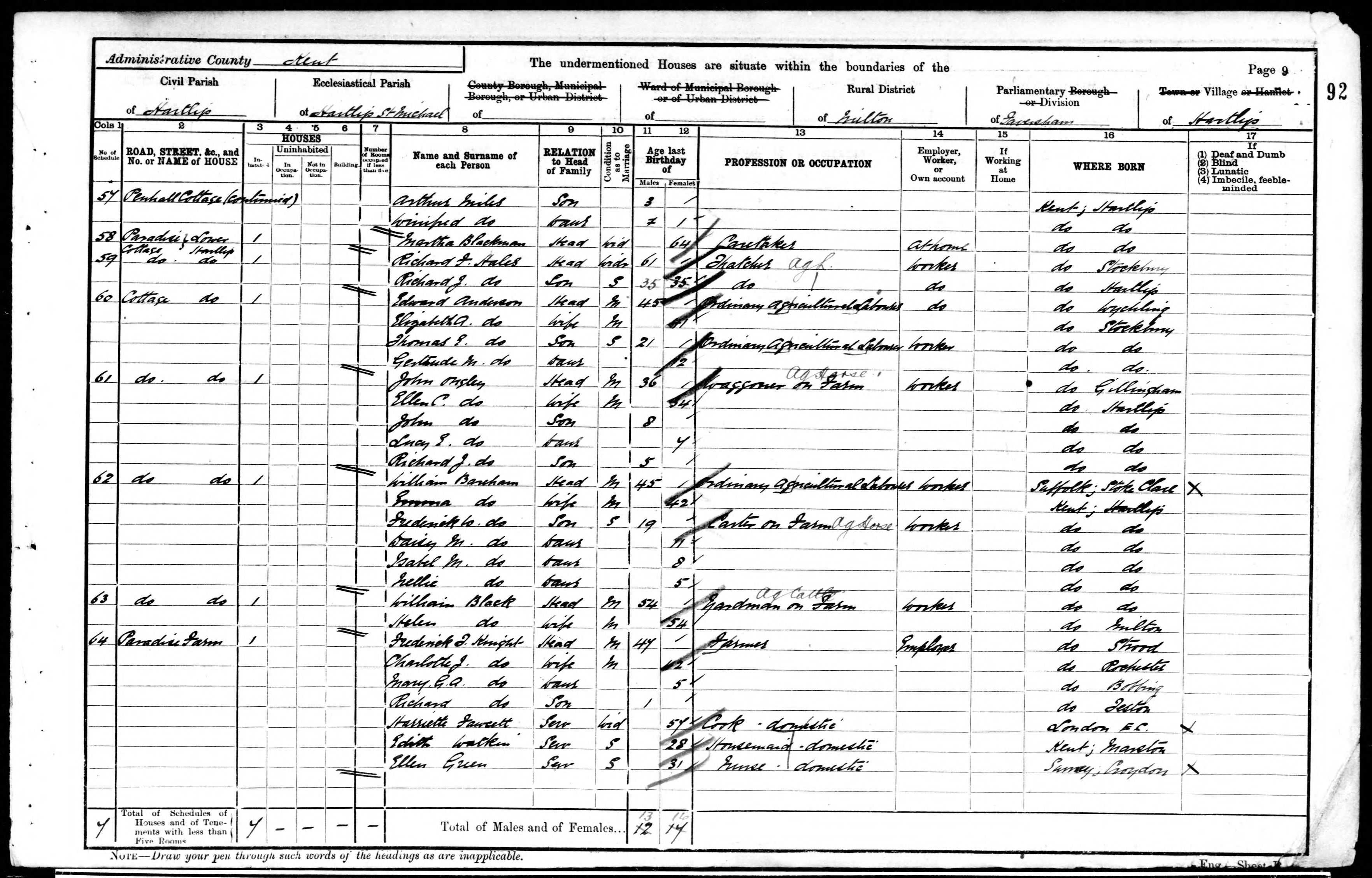 Events • Lived at: Yelsted Street, 1841, Stockbury, Kent, England. • Lived at: Yelsted, 1851, Stockbury, Kent, England. 4 • Lived at: Yelsted, 1861, Stockbury, Kent, England. 5 • Occupation: Carter, 1861, Stockbury, Kent, England. 5 • Lived at: Hill Green Cottage, 1871, Stockbury, Kent, England. 6 • Occupation: Farm Labourer, 1871, Stockbury, Kent, England. 6 • Lived at: Yelsted, 1881, Stockbury, Kent, England. • Occupation: Ag Lab, 1881, Stockbury, Kent, England. • Lived at: Lower Hartlip, 1891, Kent, England. 7 • Occupation: Farm Labourer, 1891, Lower Hartlip, Kent, England. 7 • Lived at: Paradise Cottage, 1901, Lower Hartlip, Kent, England.