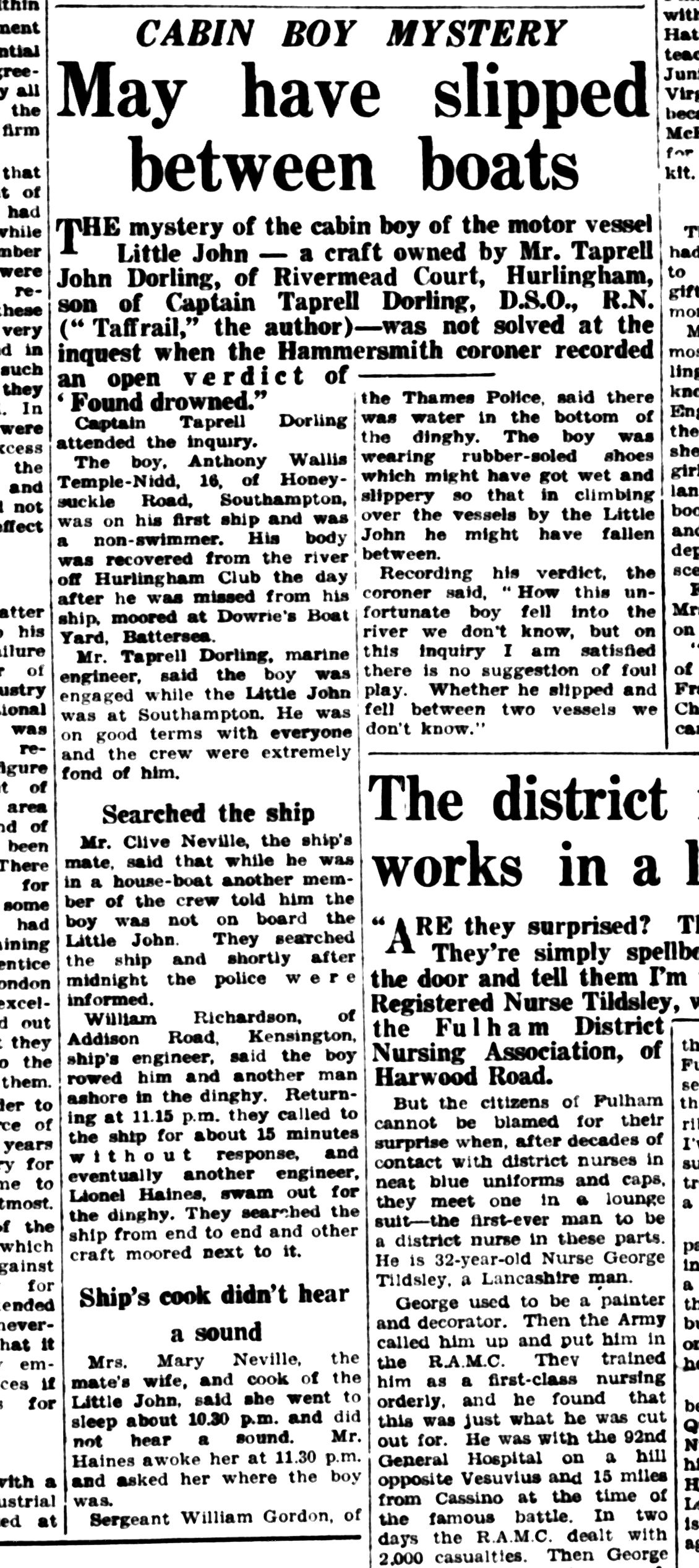 • Newspaper Article: Missing, 1949, Battersea, London, Middlesex. Thames River Police today searched for Anthony Temple-Nidd aged 16, of 20 Honeysuckle Road, Southampton, cabin-boy on the Little John, a motor-yacht moored off Dewres boat yard Battersea. Anthony disappeared between 10 and 11.30 last night. It is understood that he rowed two members of the crew to the shore. later the skiff was found tied up to the Little John, but there was no sign of the boy. He could not swim, and the police assume that he fell overboard and was drowned. WANTED TO GO TO SEA Mrs. Temple-Nidd, Anthony's mother, told the "Echo" today that he had always longed to go to sea. Small for his age - four feet ten inches he found his ambition difficult to achieve until he answeredan "Echo" advertisement for a post on the Little John. It is believed that the yacht was to leave shortly for a trip to the Mediterranean. "Anthony was very happy in his job." she said Anthony's 17th birthday would have been next week. He had been with the Little John for six months. Previously he worked at the Odean Cineman adn the Polygon Hotel. Anthony's father, who was for 17 years with the Cunard White Star died suddenly four years ago when serving as a paymaster-lieutenant in the Royal Navy. There are five other children. Anthony's eldest brother is in the Army, and there are four younger