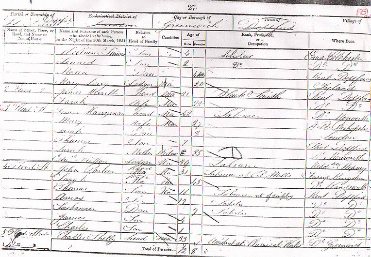 2 Published by Ancestry.co.uk (1851 English and Welsh Census(London, TNA/Ancestry.co.uk, 1952) , Web site showing copies of original enumerator schedules) ID: CEN 1851, RG 8 ? Greenwich, Deptford, page 27. Repository: Call Number: film 0087558. Cit. Date: 23 Jun 2003. Cit. ID: CEN 1851 RG* Greenwich. Surety: 4.