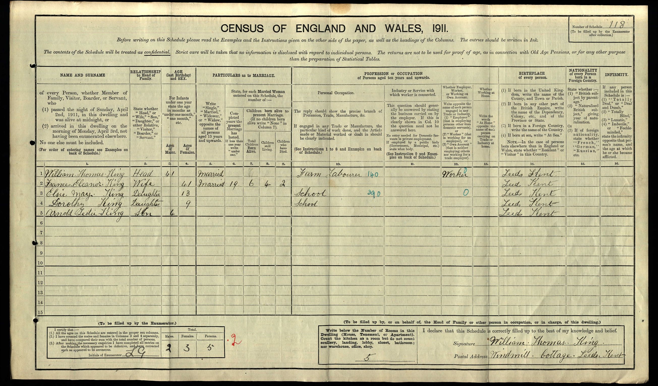 • Lived at: Windmill Cottage, 1911, Leeds, Kent, England.