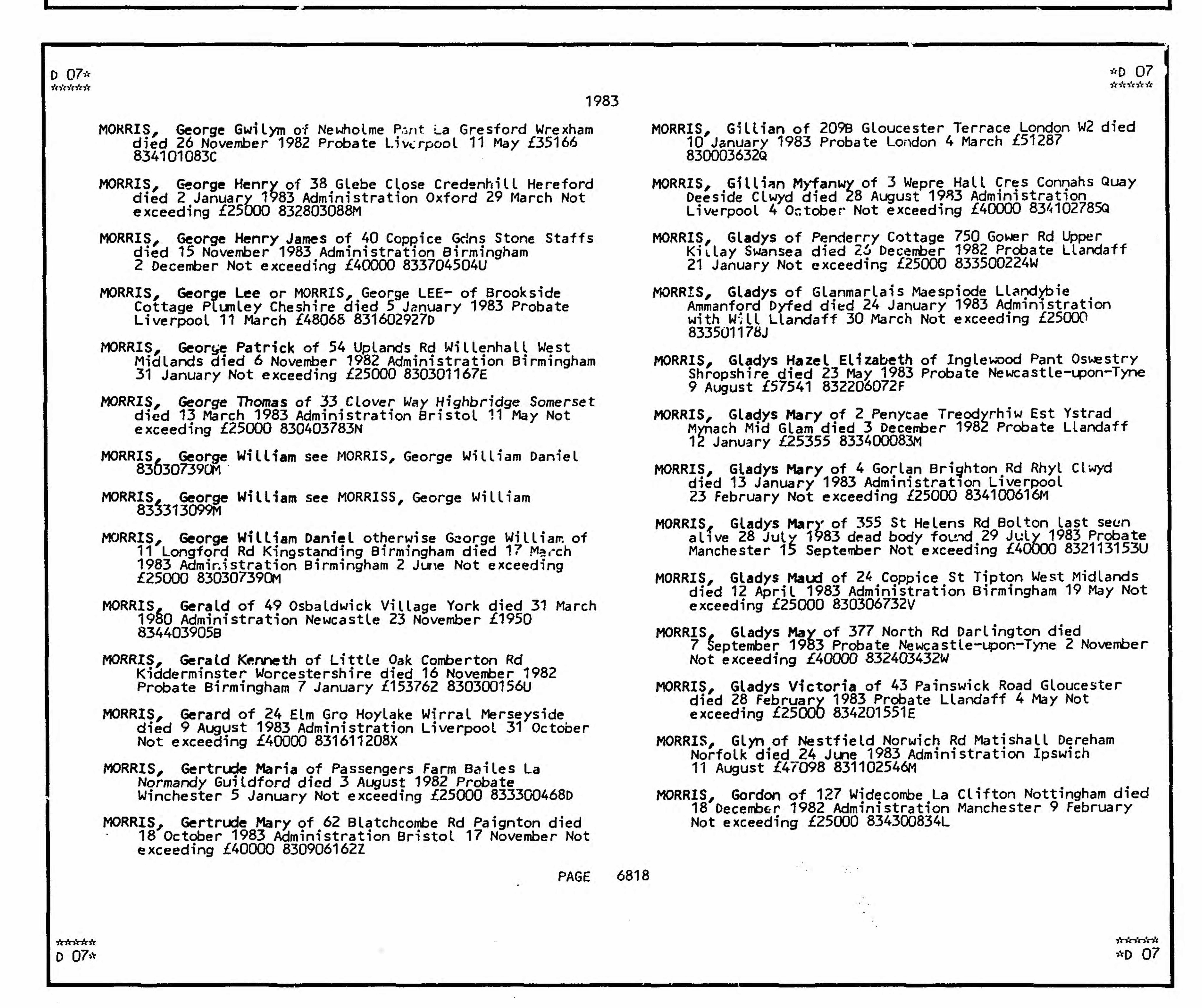 • Probate: <25K, 1983, Hereford, Herefordshire. George married someone Gladys Lillian Jeffery Sep Q 1932 in Fulham, London. (Gladys Lillian Jeffery was born Sep Q 1907 in Fulham, London and died on 29 May 1939 in London, England.) George next married Anna Valeria Matitis, daughter of Stanislaus Mataitis and Cecilia Krasovakis, on 23 Jul 1948 in Hamburg, Germany. (Anna Valeria Matitis was born on 19 Nov 1916 in Liepajas, Latvia, died on 31 Jul 2005 in Burlington, Ontario and was buried on 4 Aug 2005 in Burlington, Ontario.). The cause of her death was Cancer. |