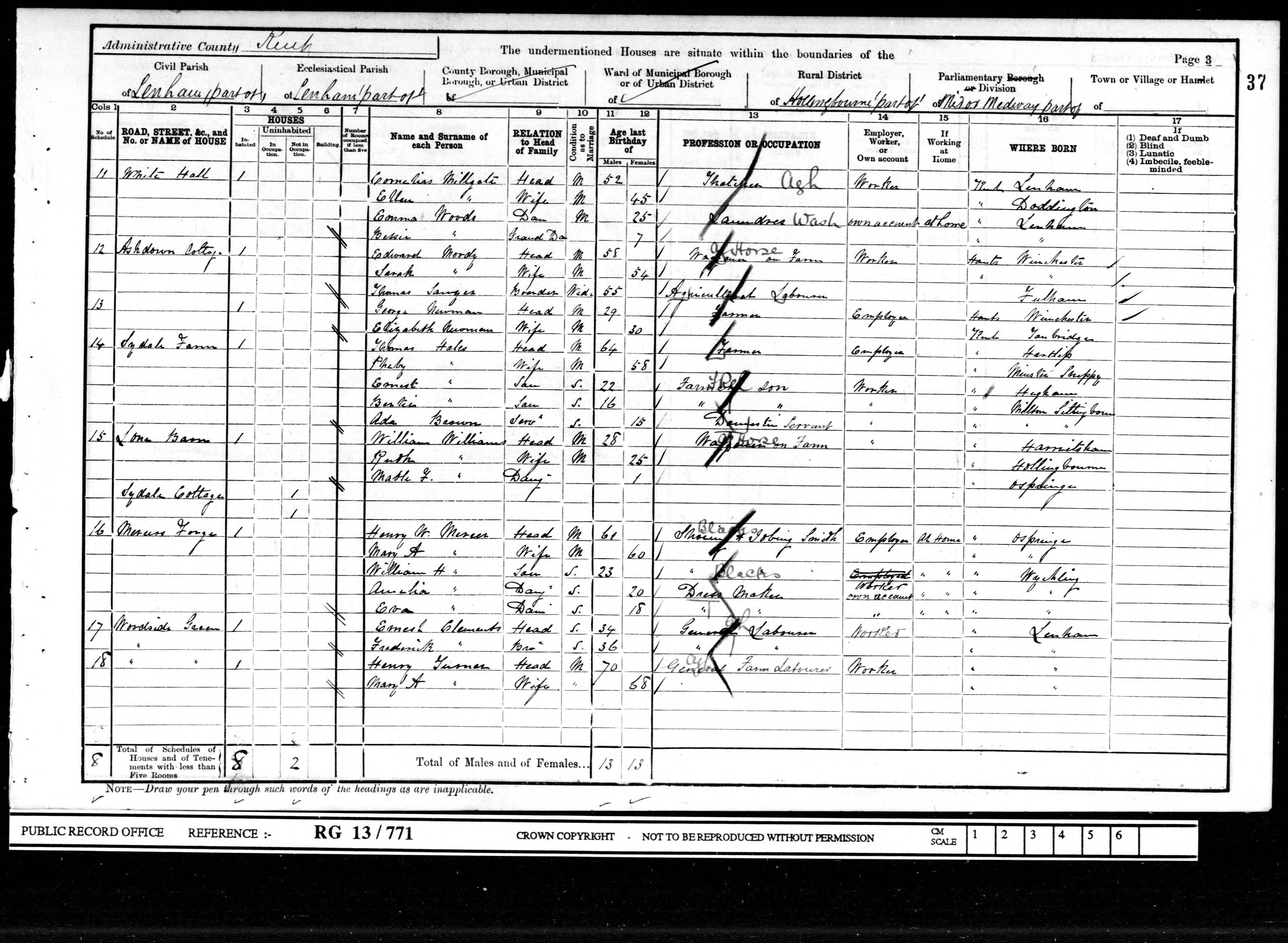 Events • Lived at: Street 2, 1841, Hartlip, Kent, England. • Lived at: The Place, 1851, Hartlip, Kent, England. 4 • Visited: Warren Cottage, 1851, Hartlip, Kent, England. 5 • Lived at: Chapel Alley, 1861, Hartlip, Kent, England. 6 • Occupation: Shepherd, 1861, Hartip, Kent. 6 • Lived at: Breach Farm, 1871, Milton, Newington, Kent, England. 7 • Occupation: Farm Servant - Indoor, 1871, Milton, Newington, Kent, England. 7 • Lived at: 1 Dellywood Cottage, 1881, Frindsbury, Kent, England. 8 • Occupation: Shepherd, 1881, Frindsbury, Kent, England. 8 • Lived at: Napier Lodge, 1891, Wrotham, Kent, England. 9 • Occupation: Farm Bailiff, 1891, Wrotham, Kent, England. 9