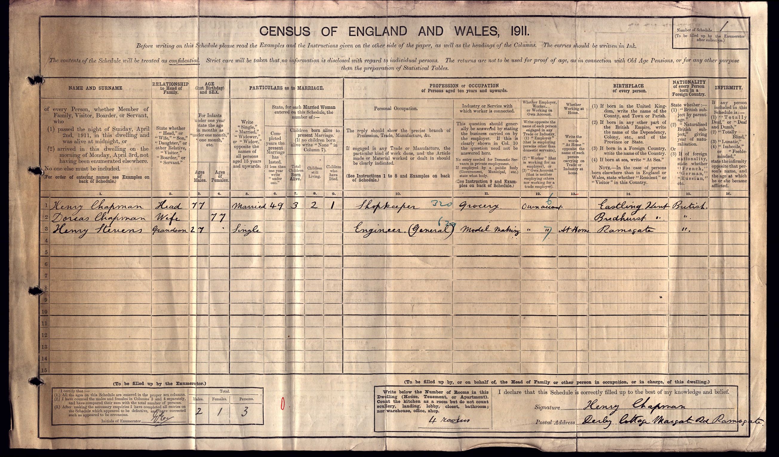 • Lived at: Derly Cottage, margate Street, 1911, Ramsgate, Kent, England. Dorcas married Henry Chapman Mar Q 1862 in Hollingbourne, Kent, England. (Henry Chapman was born circa 1832 and died after 1911.) |