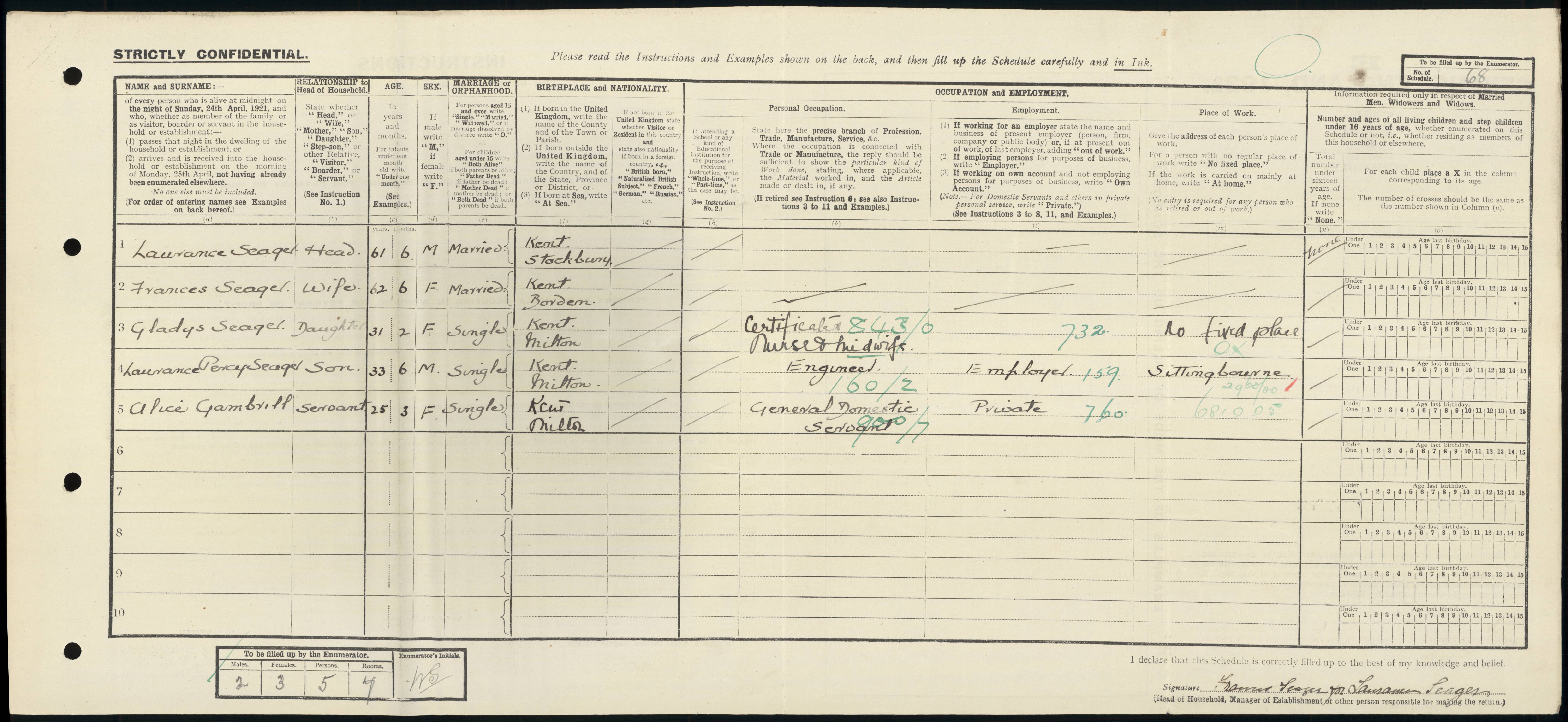 • Lived at: 102 Marina, Hastings, 1921, Sussex, England. • Probate: 18958 pounds, 1929, Ewell, Surrey. Laurence married Frances Maxstead. (Frances Maxstead was born circa 1859 in Borden, Kent, England and died after 1891.) |