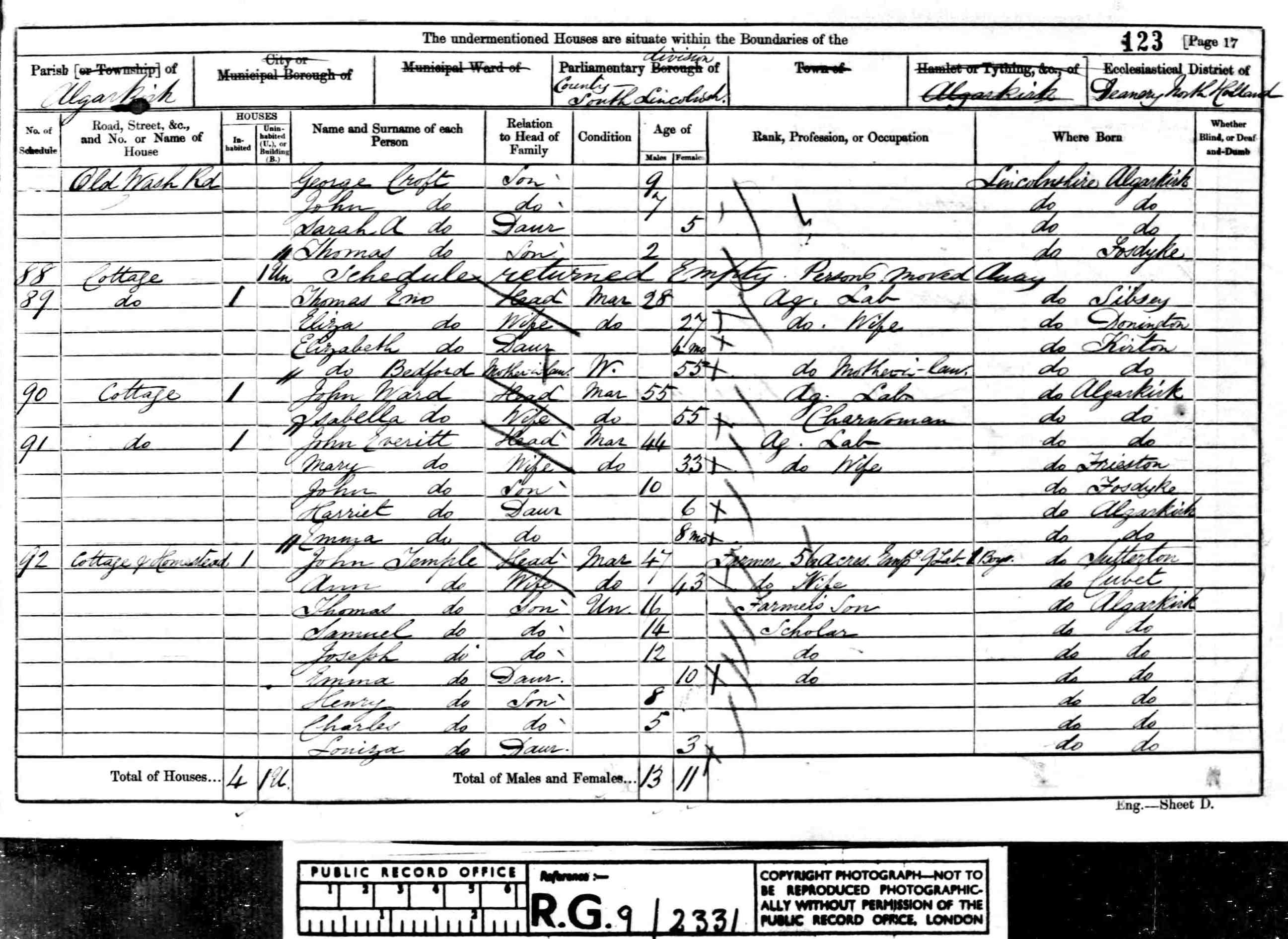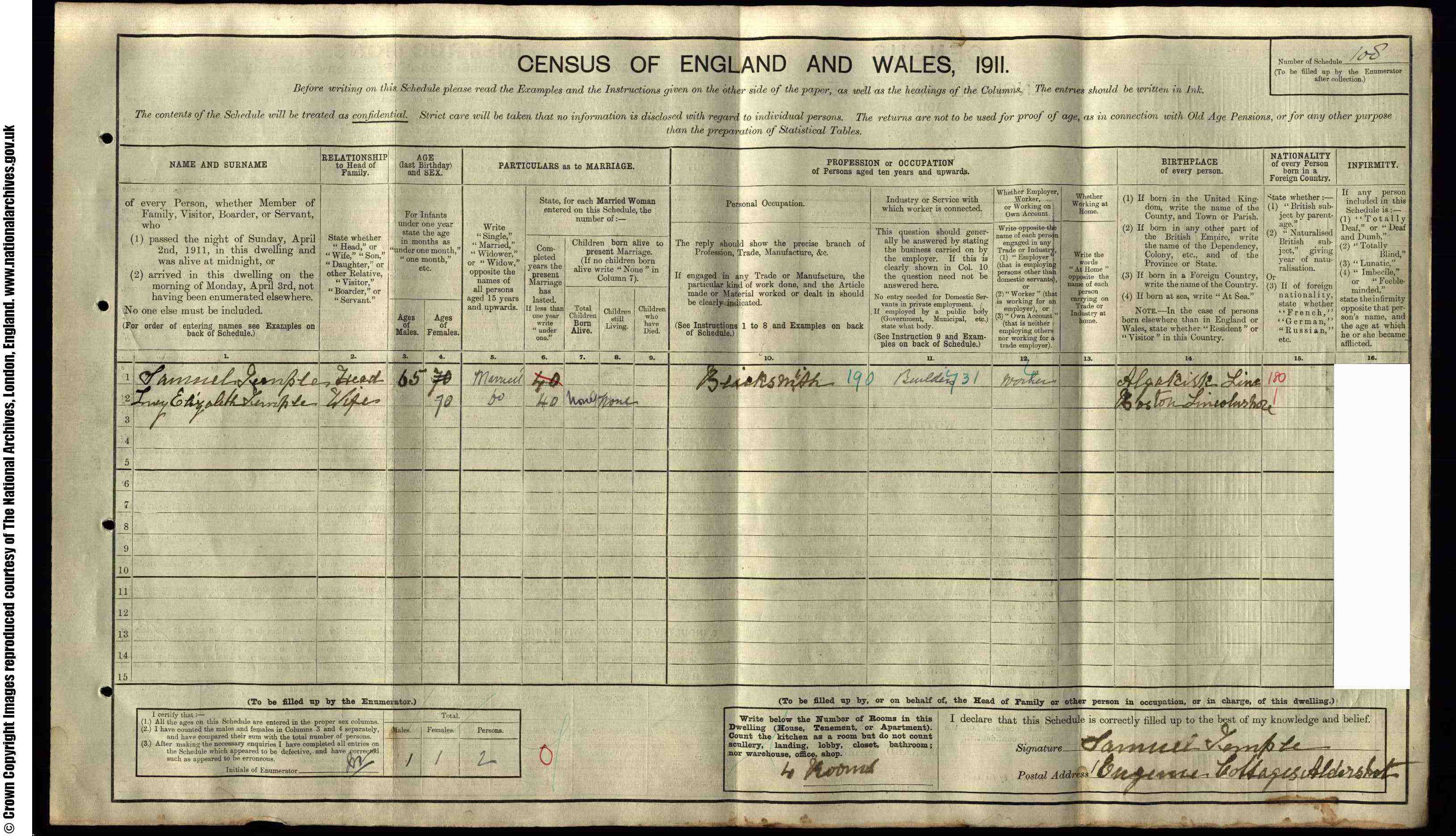 • Occupation: Farmer 56 acres employing 9 Lab and 1 boy, 1861, Algarkirk, Lincolnshire, England. 2 • Occupation: Blacksmith, 1871, Kirton, Lincolnshire, England. 4 • Lived at: 30 Raglan Street, 1881, Marylebone, London. 5 • Lived at: Boar and Gun, Skeldyke, 1871, Kirton, Lincolnshire, England. 4 • Occupation: Farrier employing 2 men, 1881, St. Pancras. 5 • Lived at: 51 Pine West Road, 1891, Kentish Town, London. 6 • Occupation: Blacksmith, 1891, Kentish Town, London. 6 • Lived at: 15 Lysens Road, 1901, Aldershot, Hampshire, England. 7 • Occupation: Blacksmith, 1901, Aldershot, Hampshire, England. 8