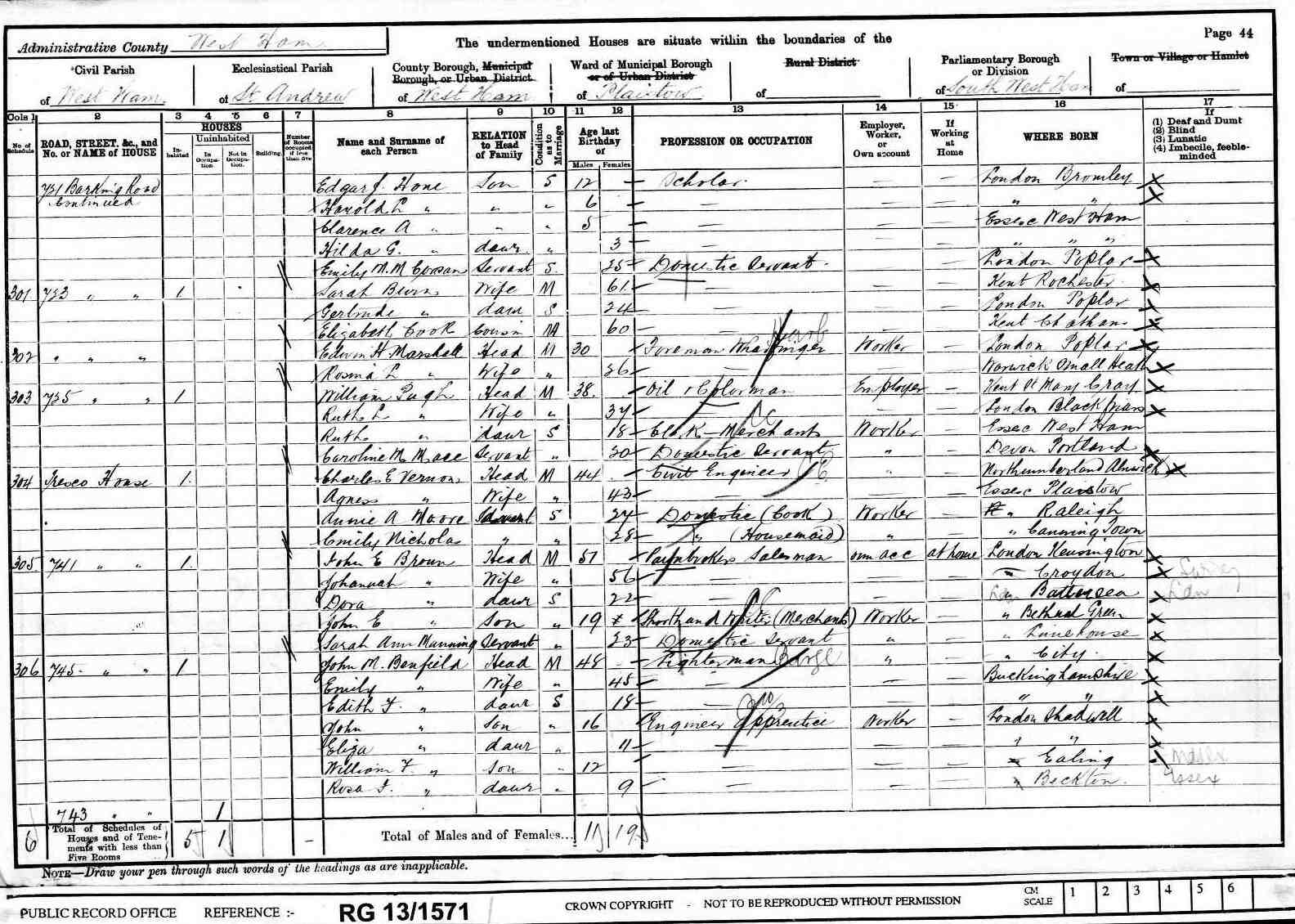 • Occupation: Domestic Servant, 1901, West Ham, London. • Occupation: Midwfie, 1917, London.