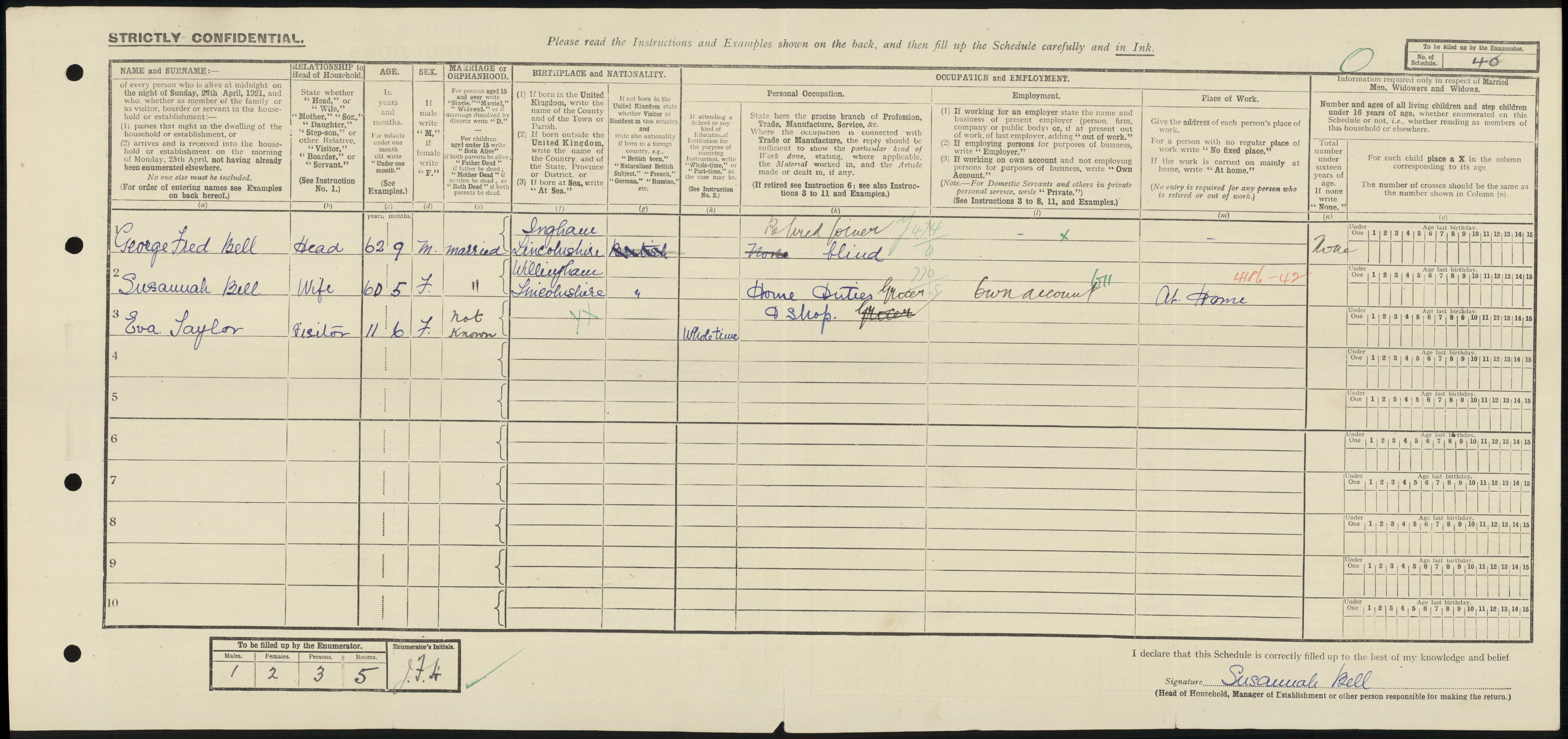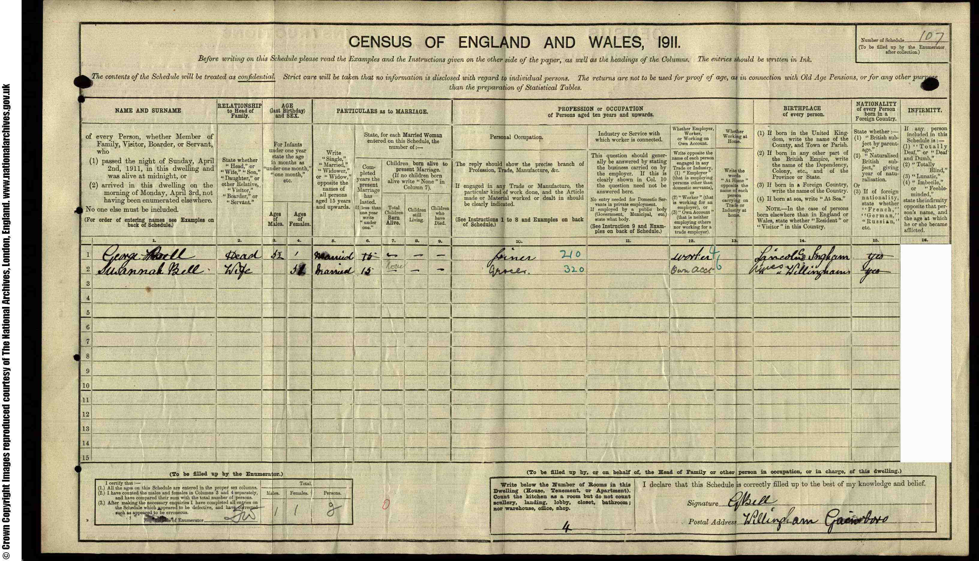 • Lived at: Willingham, Gainsborough, 1921, Willingham, Lincolnshire, England. • Occupation: Retired Joiner, Blind, 1921, Gainsborough, Lincolnshire, England. George married Susannah Grundy Dec Q 1895 in Gainsborough, Lincolnshire, England.1 (Susannah Grundy was born circa 1859 in Willingham, Lincolnshire and died after 1911.) |
