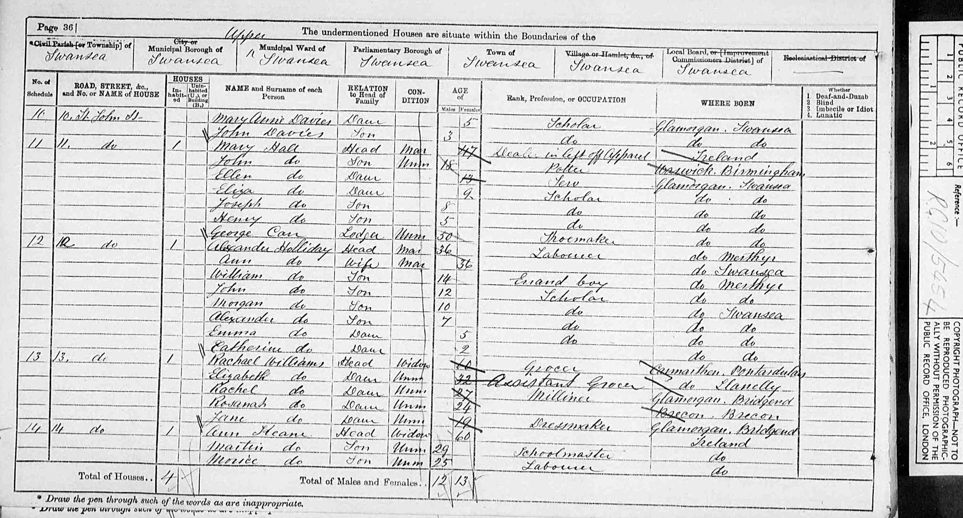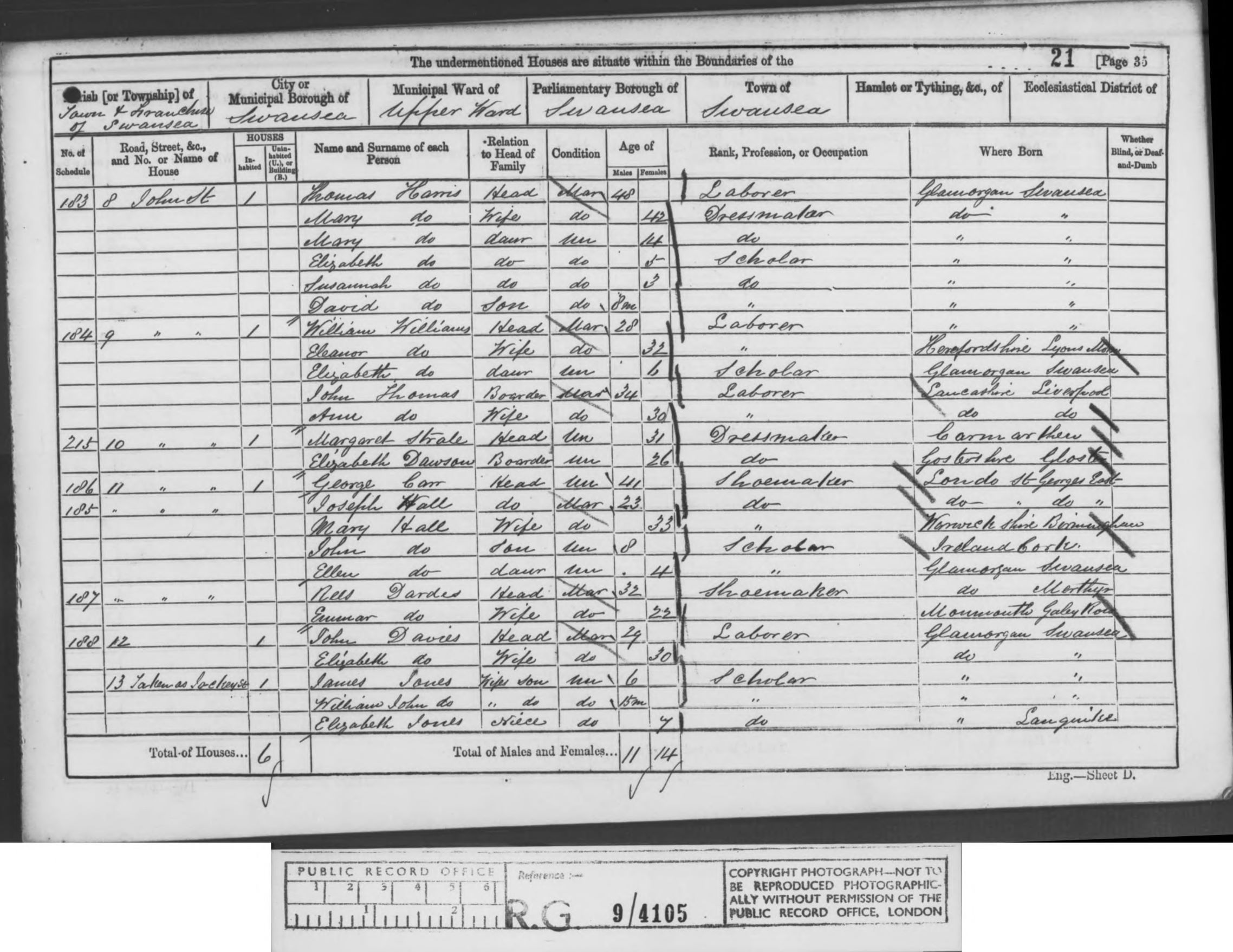 • Occupation: Shoemaker, 1861, Swansea, Glamorgan, Wales. 7 • Lived at: 11 St. Johns Street, 1871, Swansea, Glamorgan, Wales. 8