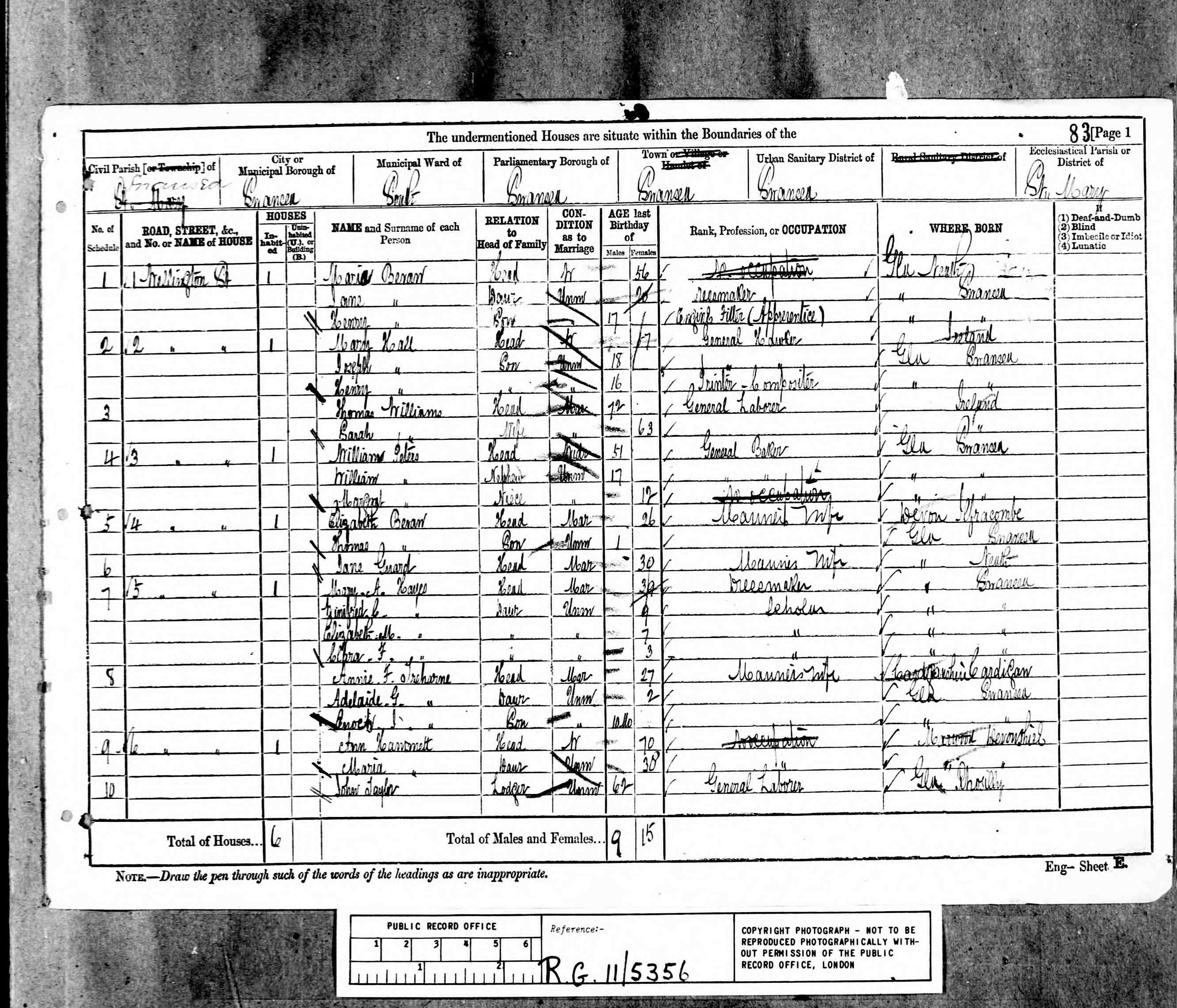 9 (1881 English and Welsh Census(London, TNA/Ancestry.co.uk, 1982) , Web site showing copies of original enumerator schedules) ID: CEN 1881, CEN 1881 RG11 5356 page 83 1 Swansea. Repository: Not Given. Cit. Date: 4 Feb 2005. Cit. ID: CEN 1881 RG11 5356 page 83 1 Swansea. Surety: 3.