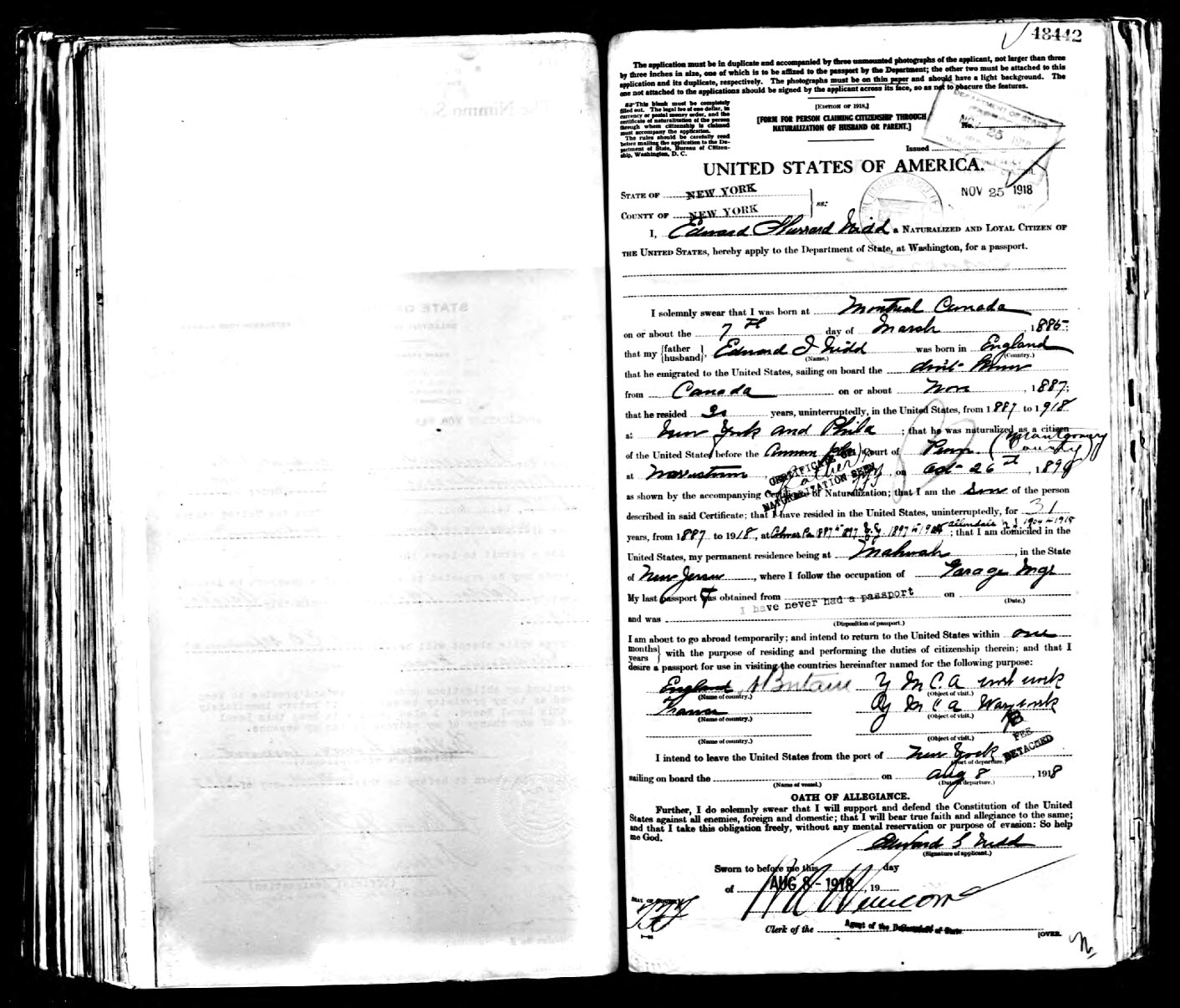 • Passport Application, 8 Aug 1918, New York.