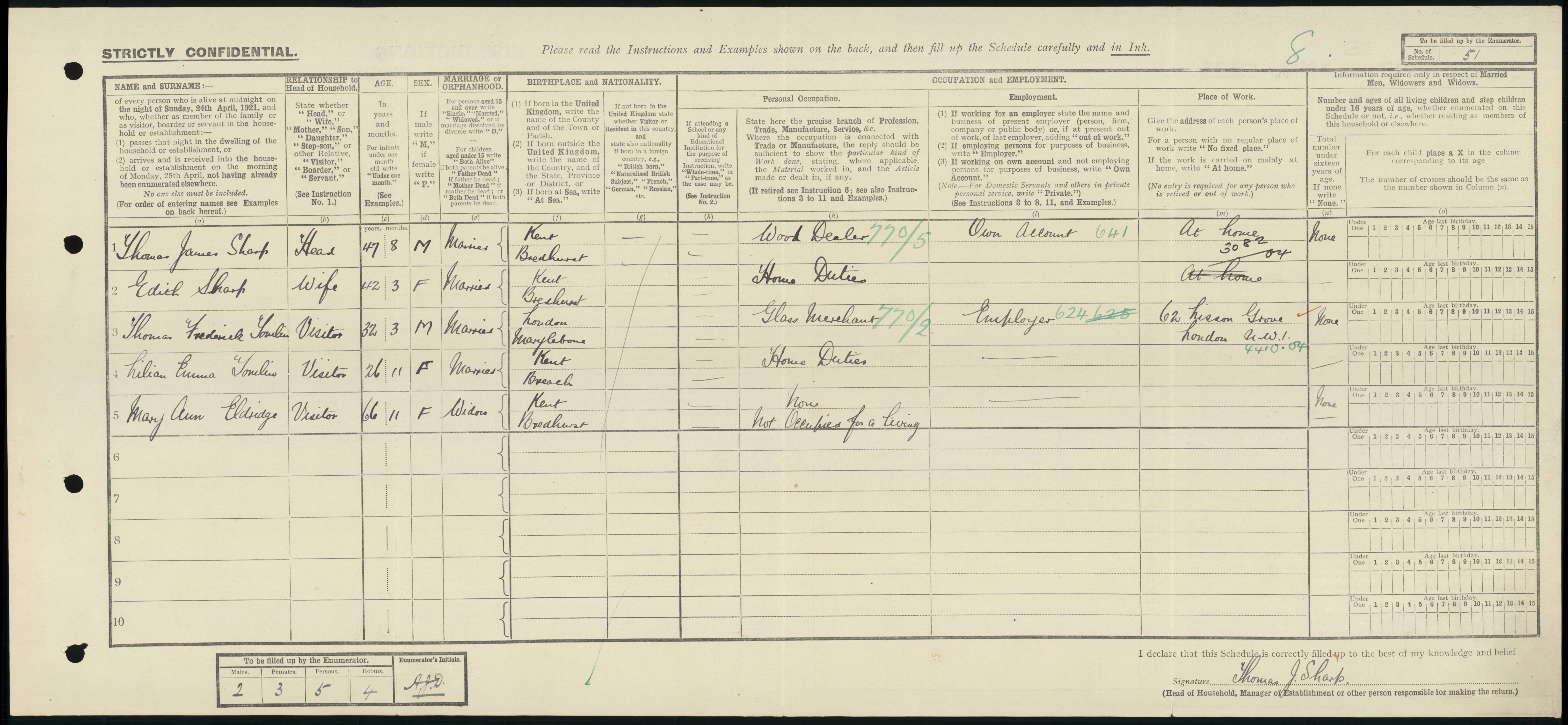 • Lived at: The Street, Bredhurst, 1921, Boxley, Kent, England. • Occupation: Wood dealer, 1939, Hollingbourne, Kent, England. Thomas married Edith Pepper on 18 Apr 1906 in Bredhurst, Kent, England. |