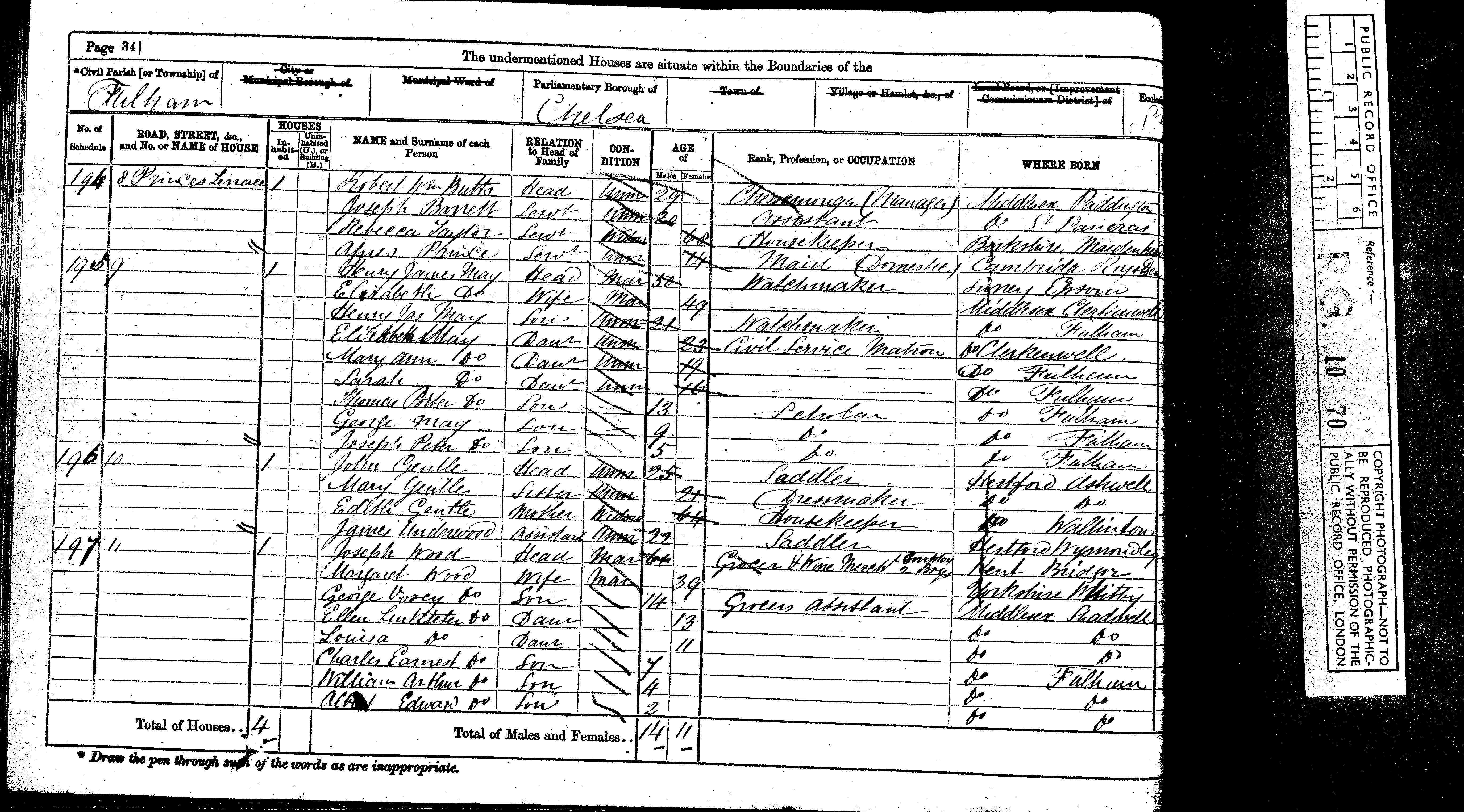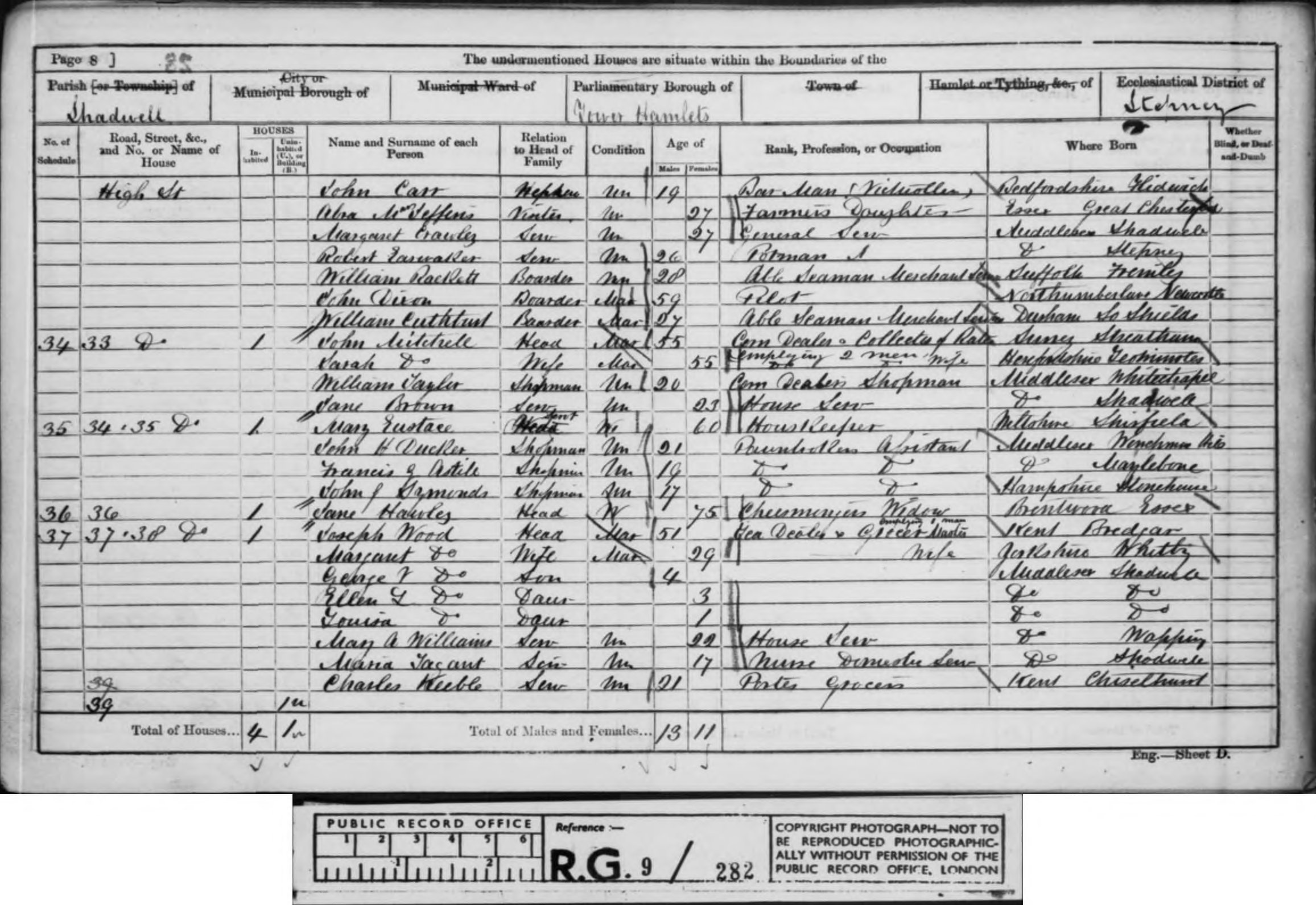 • Lived at: 37 38, 37, High Street, 1861, Shadwell, Stepney, London & Middlesex, England. • Lived at: Princes Terrace, 1871, Fulham, Kensington, London & Middlesex, England.