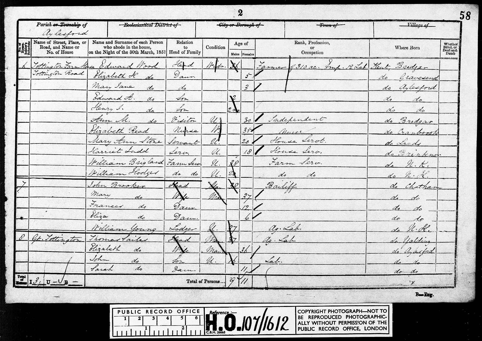 • Lived at: Tottington Farm House, Tottington Road, 1851, Aylesford, Malling, Kent, England.