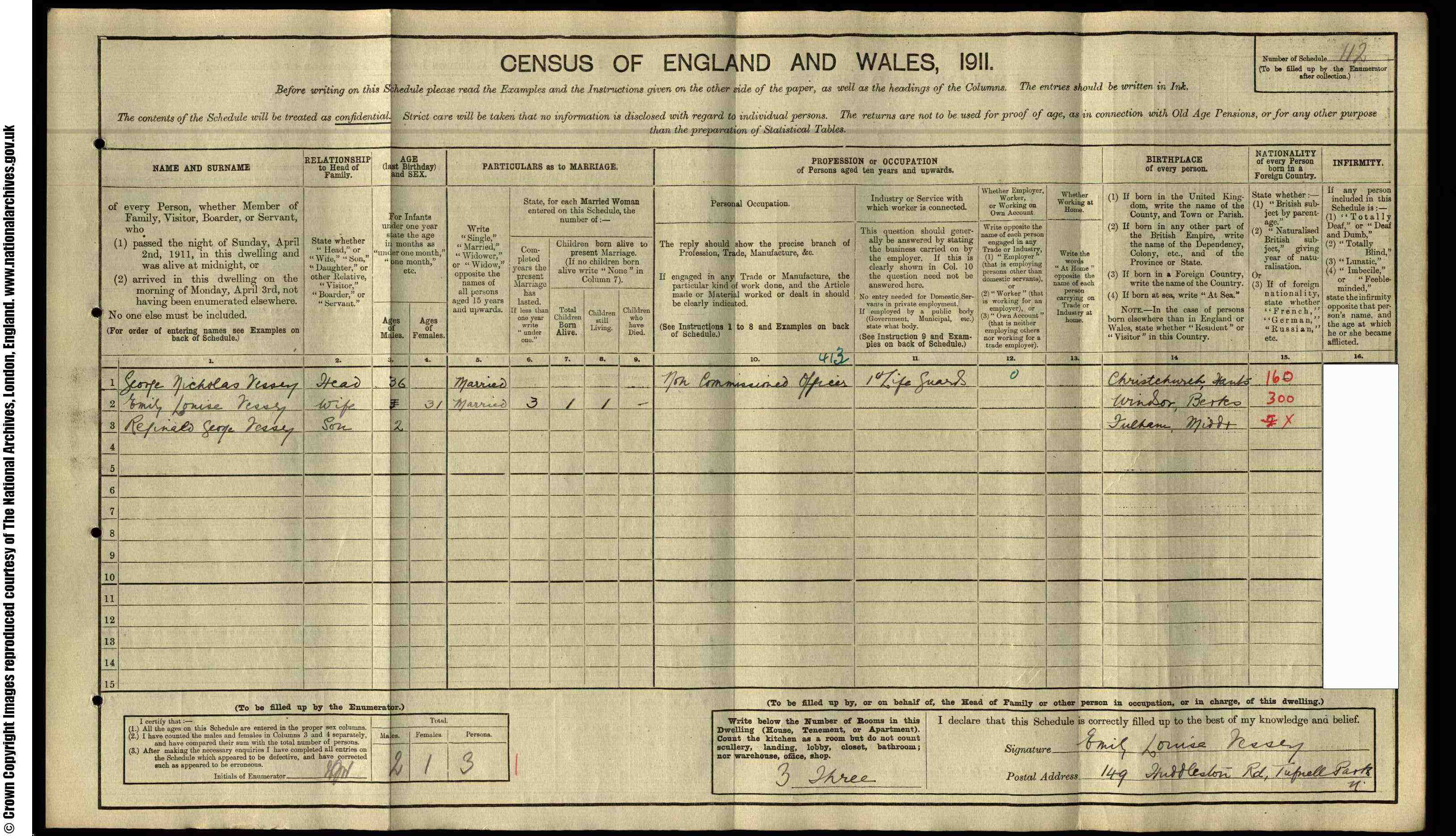 • Occupation: Non-Commissioned Officer, 1st Life Guards, 1911, Tuffnell Park. • Occupation: First Life Guards. George married Emily Louise Beaumont Sep Q 1907 in St. George H.S. (Emily Louise Beaumont was born circa 1881 in Windsor, Berkshire, England and died on 2 Jul 1937.) |